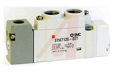 This is SYA7000 NPTF 1/4 5/2 Solenoid/Pilot Manifold Pneumatic Pilot Operated Valves manufactured by SMC. The manufacturer part number is SYA7120-02T. It performs basic function of 5/2. The product is available in manifold style. It includes a fitted solenoid yes . Whereas, the minimum operating temperature of the product is -10°c. It features 0.7 mpa maximum operating pressure. The threaded is a nptf standard. It also features nptf 1/4 connection port thread. It has a typical thread size of 1/4. This product features 5/2 number of ports. The product has a sya7000 manufacturer series. It also features solenoid/pilot actuation. It has a minimum 0.15mpa operating pressure . It has a maximum operating temperature of +60°c.