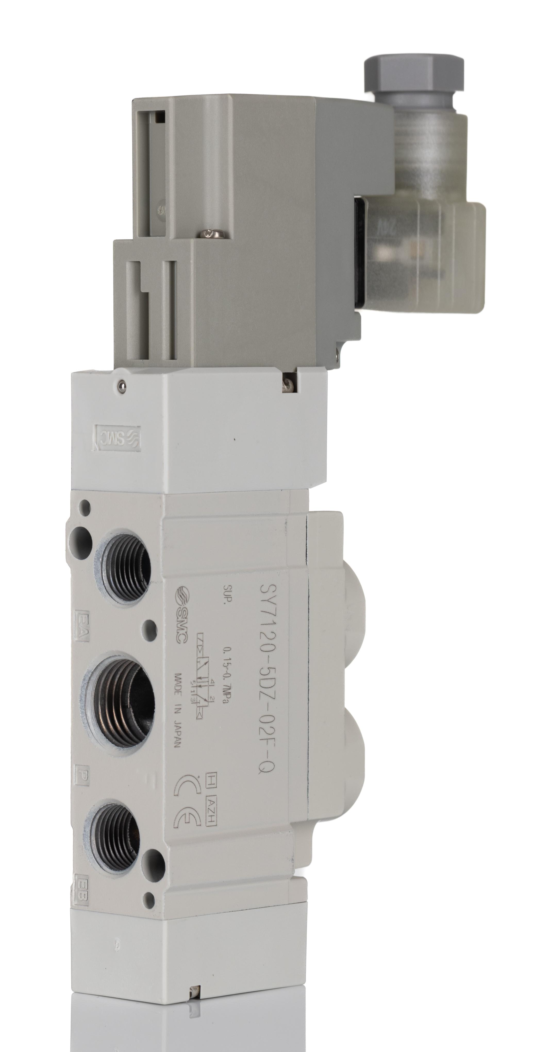 This is SY7000 G 1/4 5/2 Solenoid/Pilot Stand-Alone Pneumatic Control Valve 883.4nl/min manufactured by SMC. The manufacturer part number is SY7120-5DZ-02F-Q. It performs basic function of 5/2. The product is available in stand-alone style. It includes a fitted solenoid yes . Whereas, the minimum operating temperature of the product is -10°c. It features 0.7 mpa maximum operating pressure. The product provides up to 883.4nl/min maximum flow rate. The threaded is a g standard. It also features g 1/4 connection port thread. It has 24v dc solenoid voltage . It has a typical thread size of 1/4in. This product features 5/2 number of ports. The product's body is nicely designed from die cast aluminium materials. The product has a sy7000 manufacturer series. It also features solenoid/pilot actuation. It has a minimum 0.15mpa operating pressure . It has a maximum operating temperature of +50°c. Its solenoid power consumption is approximately 0.45w .