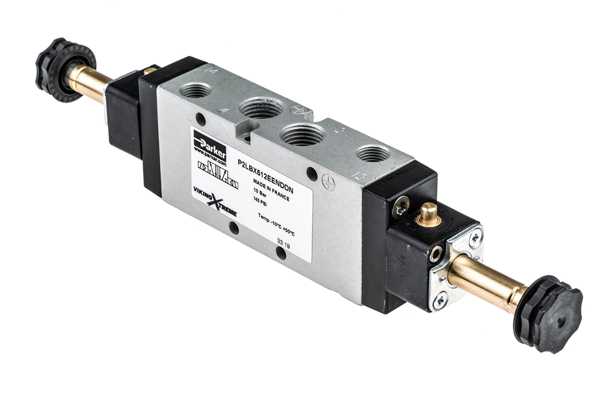 This is Viking Xtreme G 1/4 5/2 Solenoid/Solenoid Pneumatic Control Valve 38L/min manufactured by Parker. The manufacturer part number is P2LBX512EENDDN. It performs basic function of 5/2. Whereas, the minimum operating temperature of the product is -40°c. It features 16bar maximum operating pressure. The product provides up to 38l/min maximum flow rate. The threaded is a g standard. It also features g 1/4 connection port thread. It has a typical thread size of 1/4in. This product features 5/2 number of ports. The product's body is nicely designed from anodised aluminium materials. The product has a viking xtreme manufacturer series. It also features solenoid/solenoid actuation. It has a maximum operating temperature of +60°c.