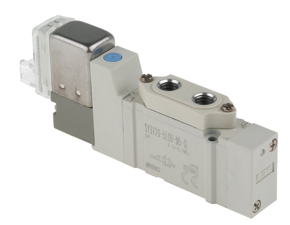 This is SY3000 Metric M5 x 0.8 5/2 Solenoid/Pilot Stand-Alone Pneumatic Control Valve 206nl/min manufactured by SMC. The manufacturer part number is SY3120-5LOU-M5-Q. It performs basic function of 5/2. It includes a fitted solenoid yes . It features 0.7 mpa maximum operating pressure. The product provides up to 206nl/min maximum flow rate. The threaded is a metric standard. It also features metric m5 connection port thread. Whereas, the minimum operating temperature of the product is -10°c. It has 24v dc solenoid voltage . The product is available in stand-alone style. This product features 5/2 number of ports. The product's body is nicely designed from die cast zinc materials. The product has a sy3000 manufacturer series. It also features solenoid/pilot actuation. It has a minimum 0.15mpa operating pressure . It has a maximum operating temperature of +50°c. Its solenoid power consumption is approximately 0.4w .