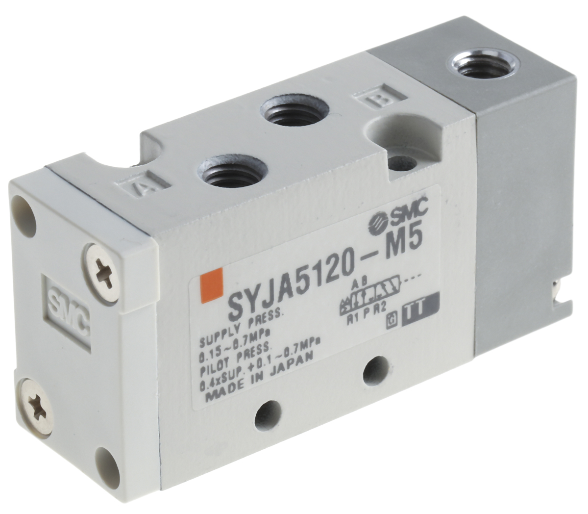 This is SYJA5000 Metric M5 x 0.8 5/2 Pilot/Pilot Stand-Alone Pneumatic Control Valve 129L/min manufactured by SMC. The manufacturer part number is SYJA5120-M5. It performs basic function of 5/2. The product is available in stand-alone style. Whereas, the minimum operating temperature of the product is -10°c. It features 0.7 mpa maximum operating pressure. The product provides up to 129l/min maximum flow rate. The threaded is a metric standard. It also features metric m5 x 0.8 connection port thread. It has a typical thread size of m5 x 0.8. This product features 5/2 number of ports. The product's body is nicely designed from die cast aluminium materials. The product has a syja5000 manufacturer series. It also features pilot/spring actuation. It has a minimum 0.15mpa operating pressure . It has a maximum operating temperature of +50°c.