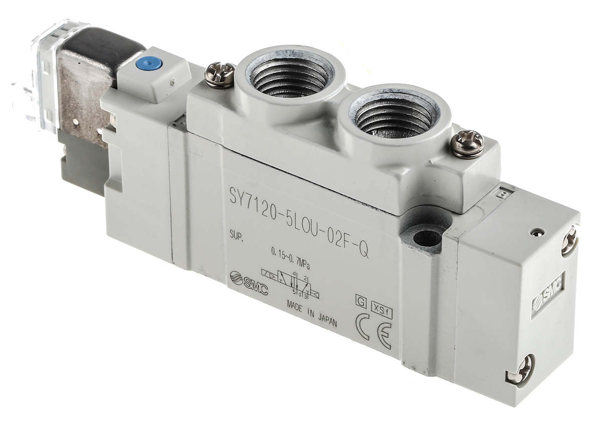 This is SY7000 G 1/4 5/2 Solenoid/Pilot Stand-Alone Pneumatic Control Valve 883.4nl/min manufactured by SMC. The manufacturer part number is SY7120-5LOU-02F-Q. It performs basic function of 5/2. The product is available in stand-alone style. It includes a fitted solenoid yes . It features 0.7 mpa maximum operating pressure. The product provides up to 883.4nl/min maximum flow rate. The threaded is a g standard. It also features g 1/4 connection port thread. Whereas, the minimum operating temperature of the product is -10°c. It has 24v dc solenoid voltage . It has a typical thread size of 1/4in. This product features 5/2 number of ports. The product's body is nicely designed from die cast aluminium materials. The product has a sy7000 manufacturer series. It also features solenoid/pilot actuation. It has a minimum 0.15mpa operating pressure . It has a maximum operating temperature of +50°c. Its solenoid power consumption is approximately 0.4w .
