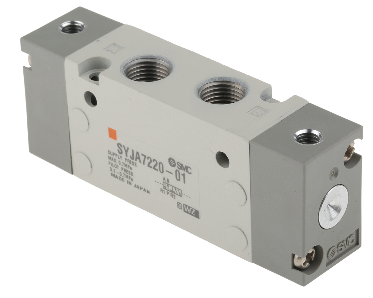 This is SYJA7000 Rc 1/8 5/2 Pilot/Pilot Stand-Alone Pneumatic Control Valve 626L/min manufactured by SMC. The manufacturer part number is SYJA7220-01. It performs basic function of 5/2. The product is available in stand-alone style. Whereas, the minimum operating temperature of the product is -10°c. It features 0.7 mpa maximum operating pressure. The product provides up to 626l/min maximum flow rate. The threaded is a rc standard. It also features rc 1/8 connection port thread. It has a typical thread size of 1/8in. This product features 5/2 number of ports. The product's body is nicely designed from die cast aluminium materials. The product has a syja7000 manufacturer series. It also features pilot/pilot actuation. It has a minimum 0.1mpa operating pressure . It has a maximum operating temperature of +50°c.