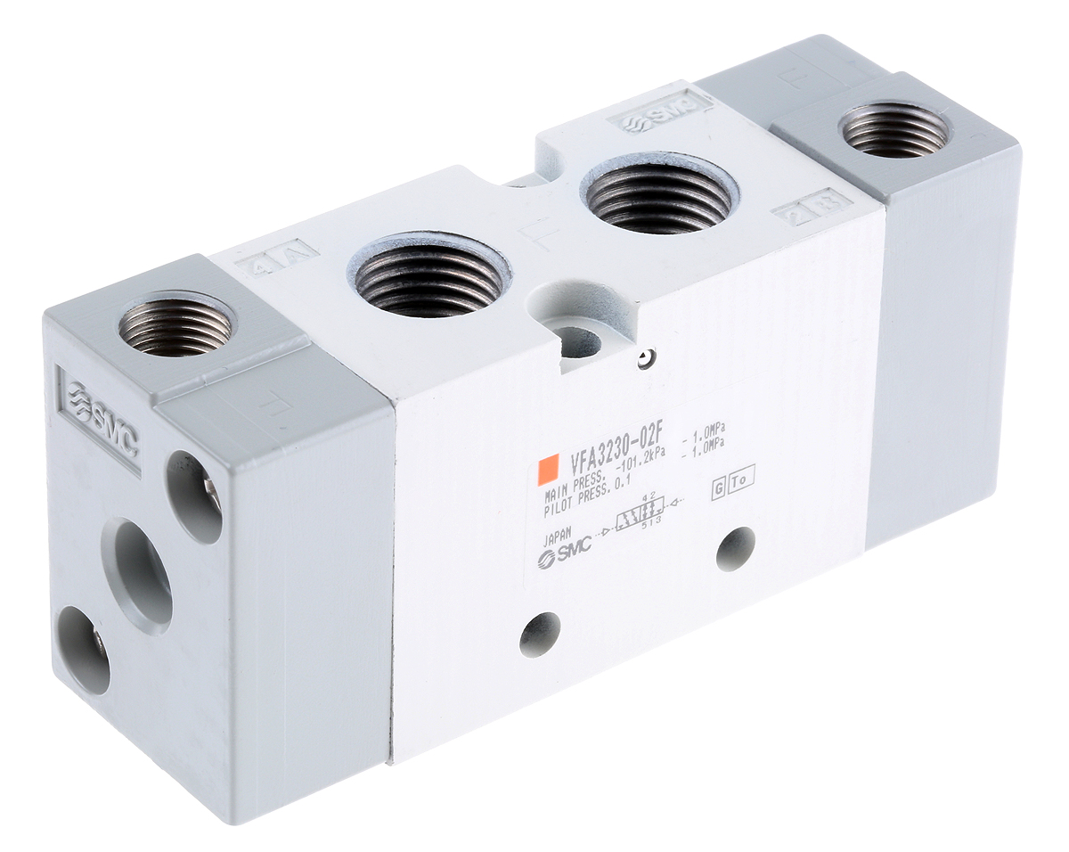 This is VFA3000 Rc 1/4 5/2 Pilot/Pilot Stand-Alone Pneumatic Control Valve 600L/min manufactured by SMC. The manufacturer part number is VFA3230-02. It performs basic function of 5/2. The product is available in stand-alone style. Whereas, the minimum operating temperature of the product is -10°c. It features 0.9 mpa maximum operating pressure. The product provides up to 600l/min maximum flow rate. The threaded is a rc standard. It also features rc 1/4 connection port thread. It has a typical thread size of 1/4in. This product features 5/2 number of ports. The product's body is nicely designed from zinc alloy materials. The product has a vfa3000 manufacturer series. It also features pilot/pilot actuation. It has a minimum 0.1mpa operating pressure . It has a maximum operating temperature of +60°c.