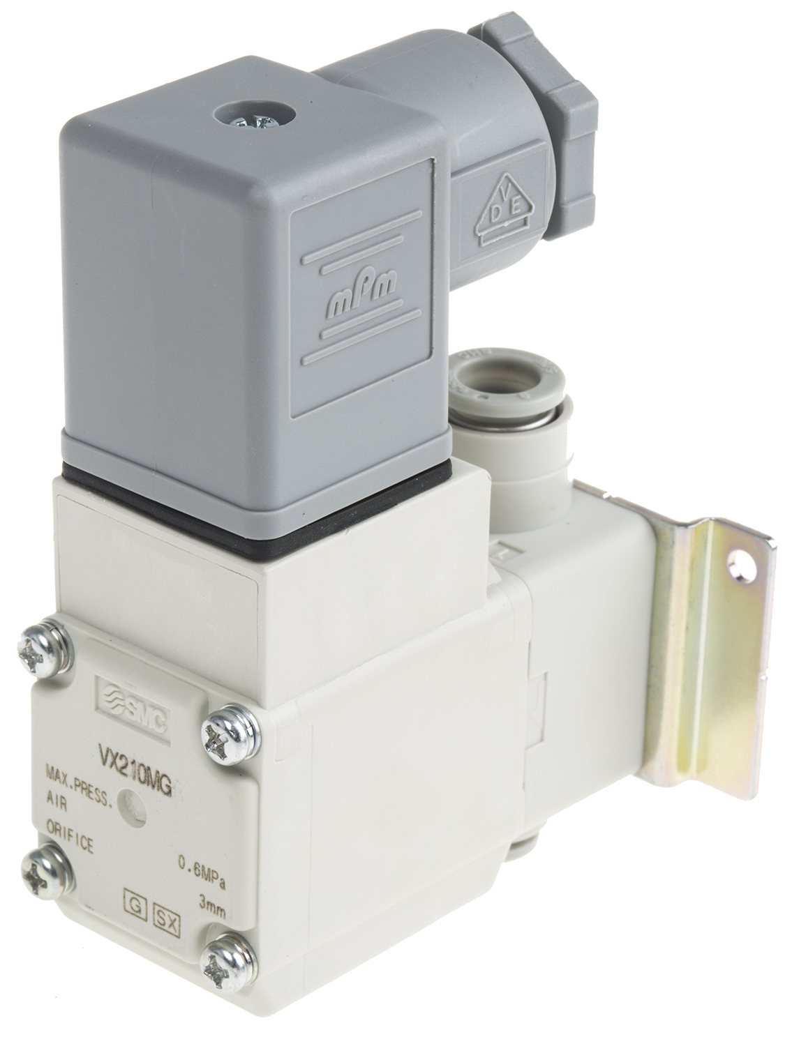 This is VX21 Push in 8 mm 2/2 Solenoid/Spring Pneumatic Solenoid Valve manufactured by SMC. The manufacturer part number is VX210MG. It performs basic function of 2/2. Whereas, the minimum operating temperature of the product is -20°c. It features 1 mpa maximum operating pressure. It also features one-touch fitting 8 mm connection port thread. It has 24v dc solenoid voltage . This product features 2 number of ports. The product's body is nicely designed from resin materials. The product has a vx21 manufacturer series. It also features solenoid/spring actuation. Its solenoid power consumption is approximately 4.5w . The product is available in normally closed configuration. It has a maximum operating temperature of +60°c. The product carries possible position value of 2.