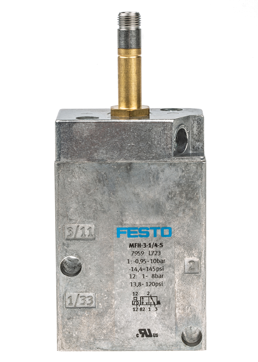 This is MFH G 1/4 Pneumatic Control Valve manufactured by Festo. The manufacturer part number is MFH-3-1/4-S. The product is available in din rail manifold, through hole style. Whereas, the minimum operating temperature of the product is -5°c. It features 10bar maximum operating pressure. The product provides up to 800 l/min maximum flow rate. The threaded is a g standard. It also features g 1/4 connection port thread. It has a typical thread size of 1/4in. This product features 3 number of ports. The product's body is nicely designed from die cast aluminium materials. The product has a mfh manufacturer series. It also features electrical actuation. It has a minimum -0.95bar operating pressure . It has a maximum operating temperature of +40°c.