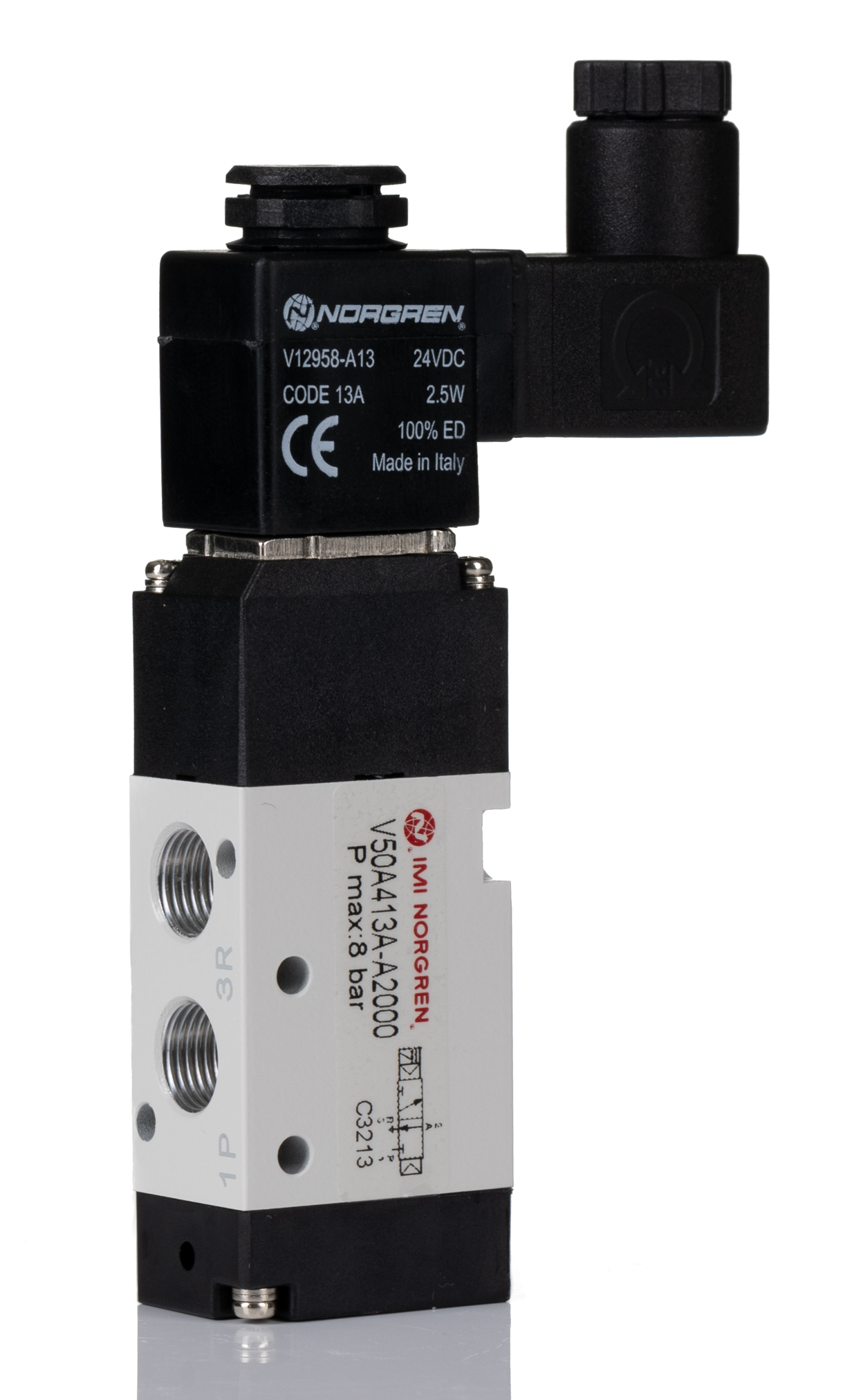 This is IMI Norgren V50 G 1/8 Solenoid/Air Inline Manifold Pneumatic Control Valve 480L/min manufactured by RS Pro. The manufacturer part number is 907-6384. The product is available in inline, manifold style. Whereas, the minimum operating temperature of the product is -5°c. It features 8bar maximum operating pressure. The product provides up to 480l/min maximum flow rate. The threaded is a g standard. It also features g 1/8 connection port thread. Its solenoid power consumption is approximately 2.9w . It has 24v dc solenoid voltage . It has a typical thread size of 1/8in. This product features 3 number of ports. The product's body is nicely designed from die cast aluminium materials. The product has a v50 manufacturer series. It also features solenoid/air actuation. It has a minimum 2bar operating pressure . The product also provides special features, such as compact and robust design, high flow in-line valves, low power energy efficient solenoids. The product is available in 3/2 configuration. It has a maximum operating temperature of +50°c. The product carries possible position value of 2.