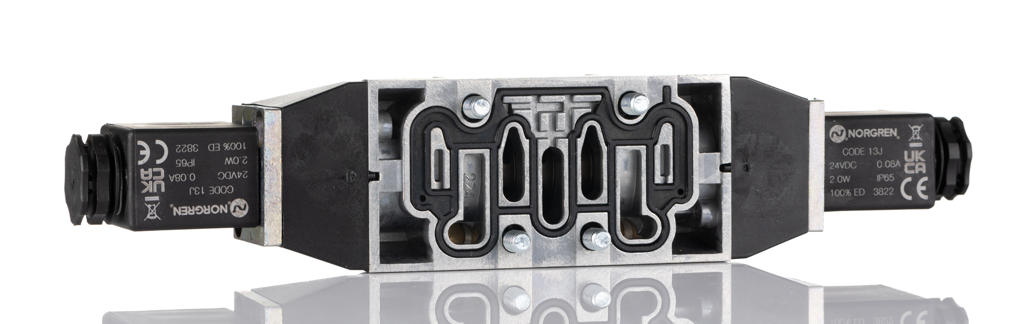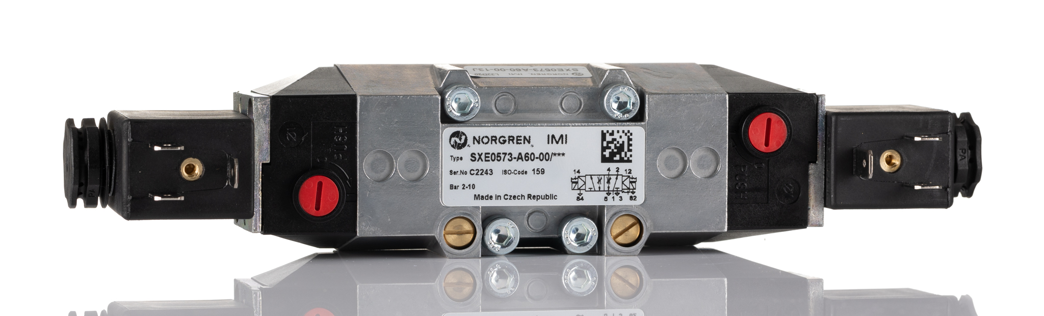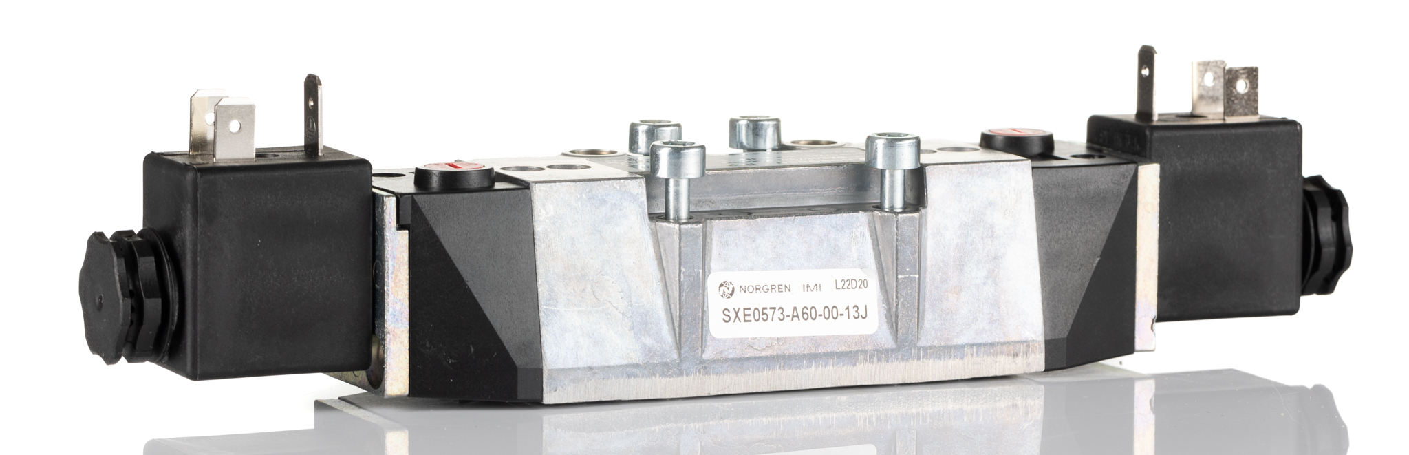 This is 5/2 Pneumatic Solenoid Valve - Solenoid/Solenoid ISO Star Series 24V dc manufactured by Norgren. The manufacturer part number is SXE0573-A60-00-13J. It performs basic function of 5/2. Is it a better world product? yes. It includes a fitted solenoid yes . Whereas, the minimum operating temperature of the product is -15°c. It features 10 bar maximum operating pressure. The product provides up to 1230l/min maximum flow rate. It has a minimum 2bar operating pressure . It has 24v dc solenoid voltage . The product is available in sub base style. This product features 5 number of ports. The product's body is nicely designed from anodised aluminium materials. The product has a iso star manufacturer series. It also features solenoid/solenoid actuation. It has a maximum operating temperature of +80°c. The product carries possible position value of 2.