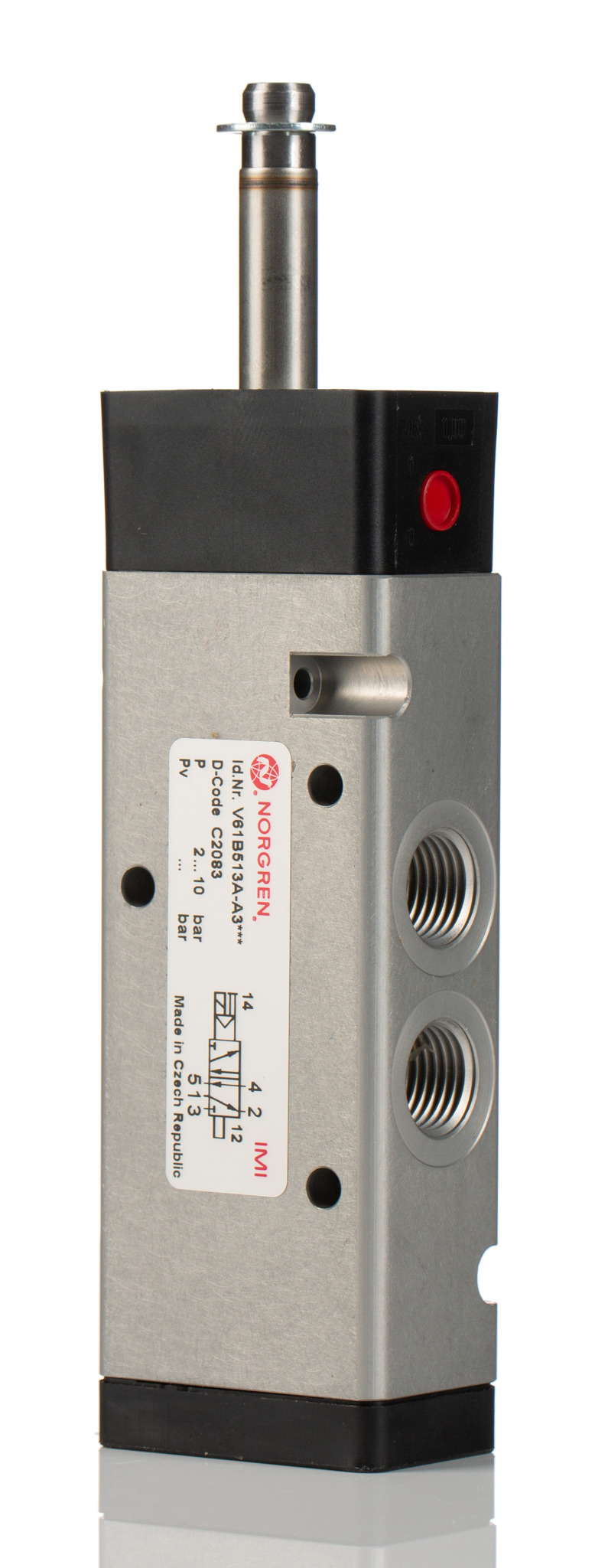 This is 5/2 Pneumatic Solenoid Valve - Solenoid/Air G 1/4 V61 Series manufactured by Norgren. The manufacturer part number is V61B513A-A3000. It performs basic function of 5/2. The product is available in inline style. Whereas, the minimum operating temperature of the product is -10°c. It features 10 bar maximum operating pressure. The product provides up to 1300l/min maximum flow rate. The threaded is a g standard. It also features g 1/4 connection port thread. It has a typical thread size of 1/4in. This product features 5 number of ports. The product's body is nicely designed from aluminium materials. The product has a v61 manufacturer series. It also features solenoid/air actuation. It has a minimum 2bar operating pressure . The product is available in 2-position, 5 port configuration. It has a maximum operating temperature of +50°c. The product carries possible position value of 2.