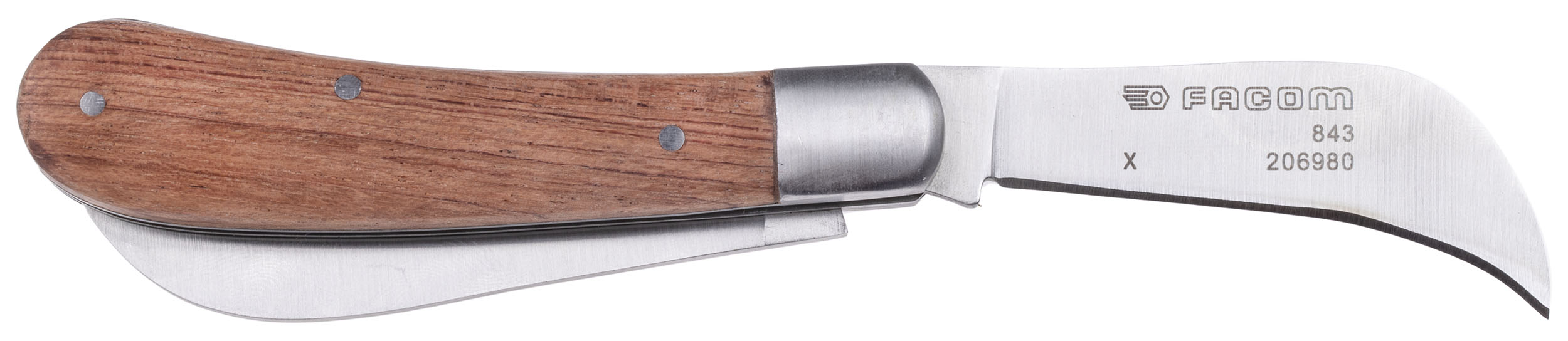 This is Knife with Various Features manufactured by Facom. The manufacturer part number is 843. It has a twin type blade . It is retractable yes . The typical product's weight is 115g. The product twin-blade, is a highly preferred choice for users. It has an overall length of 180 mm. Its comfortable handle is manufactured from durable wood material. The blade has a length of 80 mm. It includes a/an electrician knife type knife . It has about 100mm closed length . In addition, its blade is made up of stainless steel material .