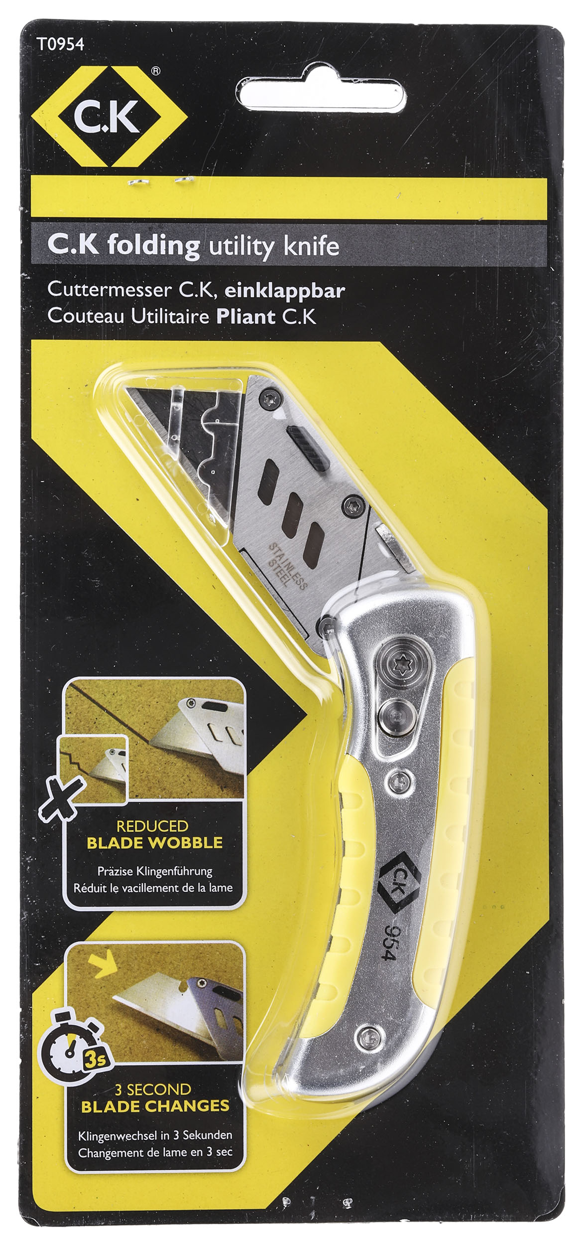 This is 6mm Folding; Utility Knife manufactured by CK. The manufacturer part number is T0954. It has a straight type blade . It includes a/an folding knife type knife . It is retractable yes .