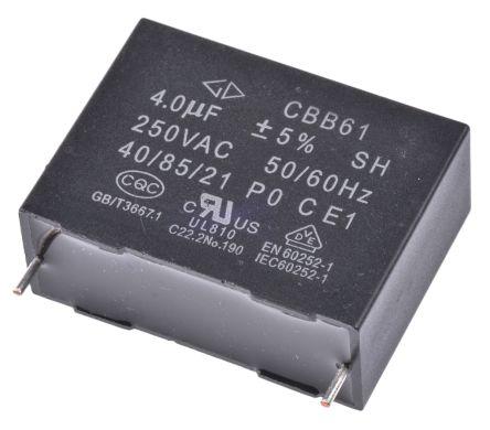 This is 4μF Polypropylene Capacitor PP 250V ac ±5% Tolerance Through Hole manufactured by RS Pro. The manufacturer part number is 843-2048. It features a given value of +5% tolerance plus. The given dimensions of the product include 36 x 14 x 27mm. The product is available in through hole configuration. It provides a 4 µf of capacitance value. It has a maximum operating temperature of +85°c. It is from film capacitor family . Its accurate length is 36mm. It provides a dissipation factor of ≤0.2%. In addition, the height is 27mm. Applications Information involves ac motor. The product comes in 14mm depth. It carries a 250 v ac of voltage. The dielectric options include polypropylene film. The terminal is a through hole type. The lead features 32.5mm pitch. Whereas its dielectric material family is polypropylene (pp). It features ±5% of tolerance value. While it has tolerance minus of -5%.