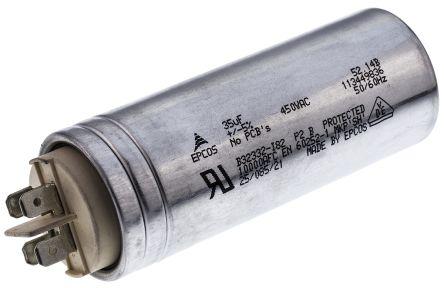 This is 35μF Polypropylene Capacitor (PP) 450 V ac ±5% Tolerance Stud Mount B32332 Series manufactured by EPCOS. The manufacturer part number is B32332I6356J082. It features a given value of +5% tolerance plus. The given dimensions of the product include 35 (dia.) x 103mm. The product is available in stud mount configuration. It provides a 35 µf of capacitance value. The product b32332, is a highly preferred choice for users. In addition, the height is 103mm. Applications Information involves sine wave. While it has tolerance minus of -5%. It carries a 450 v ac of voltage. Whereas, the minimum operating temperature of the product is -25°c. It has a maximum operating temperature of +85°c. It features ±5% of tolerance value. The terminal is a stud mount type. The dielectric options include pp.