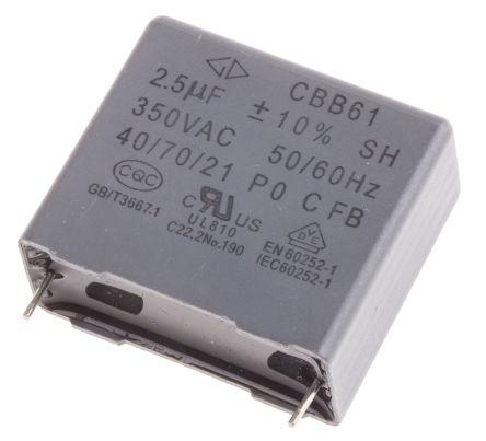 This is 2.5μF Polypropylene Capacitor PP 350V ac ±10% Tolerance Through Hole manufactured by RS Pro. The manufacturer part number is 843-2020. The given dimensions of the product include 32 x 14 x 28mm. The product is available in through hole configuration. It has a maximum operating temperature of +85°c. Its accurate length is 32mm. It provides a dissipation factor of ≤0.2%. In addition, the height is 28mm. It provides a 2.5 µf of capacitance value. The product comes in 14mm depth. It carries a 350 v ac of voltage. The dielectric options include polypropylene film. The lead features 27.5mm pitch. It features ±10% of tolerance value. The terminal is a through hole type. Whereas its dielectric material family is polypropylene (pp).