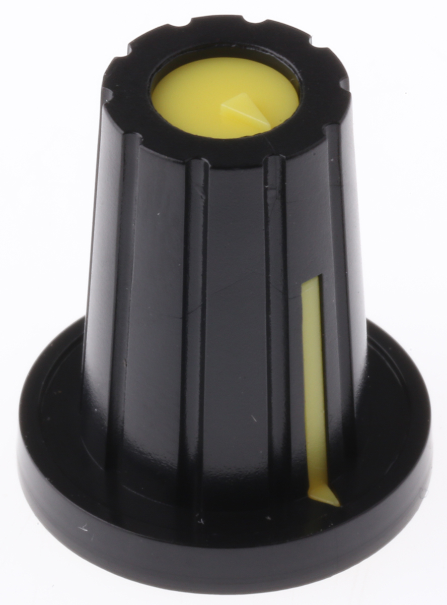This is Potentiometer Knob Body: Black for use with knob Dia. 17mm with a Yellow Indicator 6.4mm Shaft manufactured by RS Pro. The manufacturer part number is 467-6746. Its overall knob diameter is about 17mm . The product is made from highly stable and reliable plastic. It contains a push-on type knob . Additionally, the product has a d shaped type shaft . It is designed with yellow colour indicator . Its body is of black colour . While the shaft's size is 6.4mm. Its knob is 19.5mm in height . The product is highly suitable for potentiometer.