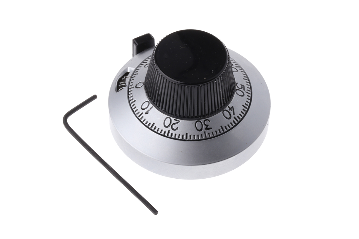 This is Potentiometer Knob Dial Type 46mm Knob Diameter Chrome 6mm Shaft manufactured by Vishay. The manufacturer part number is 21B11B10. Its overall knob diameter is about 46mm . The product is made from highly stable and reliable satin. It contains a dial type knob . Additionally, the product has a circular type shaft . Consist of 15 turns. It is designed with black colour indicator . Its body is of chrome colour . While the shaft's size is 6mm. Its knob is 25.4mm in height . It has a model model 21.