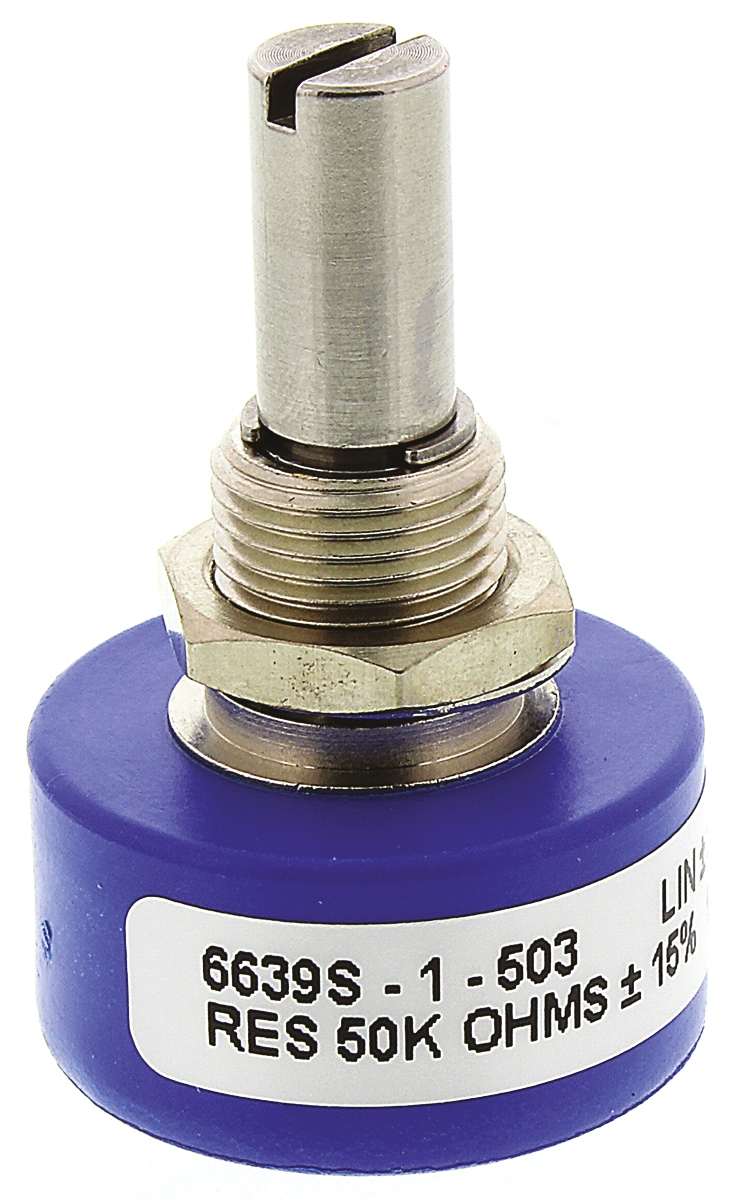 This is 6639 Series Conductive Plastic Potentiometer with a 6.35 mm Dia. Shaft Continuous-Turn 50kΩ ±15% 1W manufactured by Bourns. The manufacturer part number is 6639S-1-503. The diameter of the shaft is 6.35 mm. The product carries slotted shaft actuator. The product is available in panel mount configuration. It includes a/an rotary type potentiometer . The product 6639, is a highly preferred choice for users. Moreover, it has solder turret terminal style. It comprises 1 gangs. Consist of continuous turns. The shaft is 22.2mm long. It includes a/an linear electrical taper . Feature 1w of power rating. Moreover, its element is of conductive plastic material . It features ±15% of tolerance value. The product offers a maximum resistance up to 50kω.