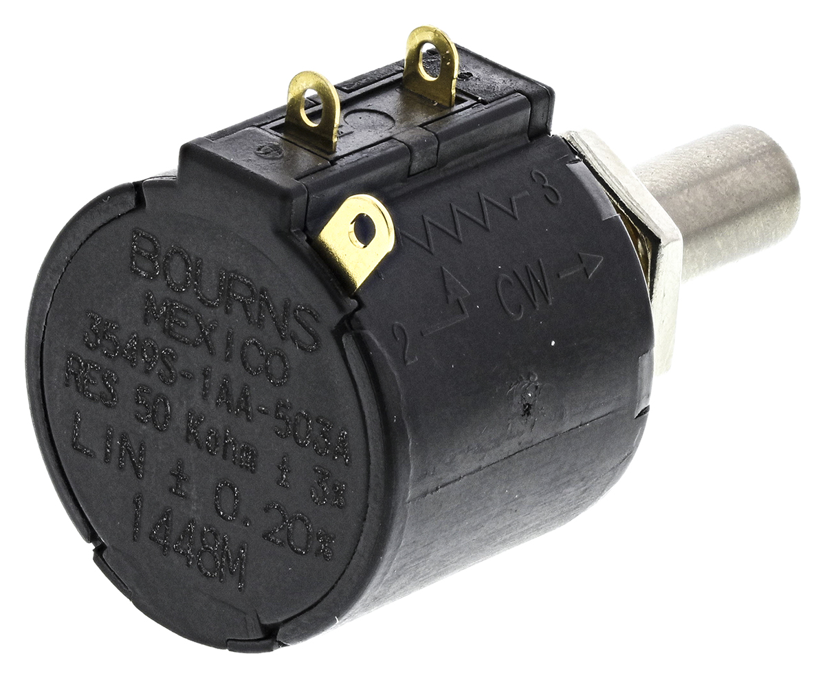 This is 3549 Series Wirewound Potentiometer with a 6.35 mm Dia. Shaft 10-Turn 50kΩ ±3% 2W ±50ppm/°C Panel Mount manufactured by Bourns. The manufacturer part number is 3549S-1AA-503A. The diameter of the shaft is 6.35 mm. The product is available in panel mount configuration. It includes a/an rotary type potentiometer . The product 3549, is a highly preferred choice for users. Moreover, it has solder lug terminal style. It comprises 1 gangs. Consist of 10 turns. The shaft is 20.6mm long. The product carries slotted shaft actuator. It includes a/an linear electrical taper . Feature 2w of power rating. Moreover, its element is of wirewound material . It features ±3% of tolerance value. The product offers a maximum resistance up to 50kω.
