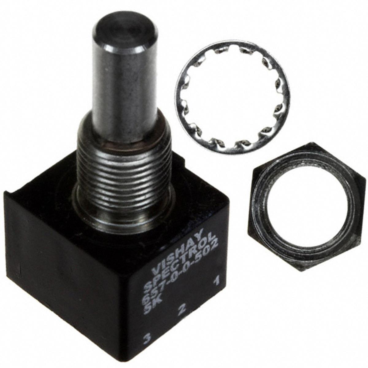 This is 657 Series Conductive Plastic Potentiometer with a 6.35 mm Dia. Shaft 5kΩ ±20% 1W ±600ppm/°C manufactured by Vishay. The manufacturer part number is 657-0-0-502. The diameter of the shaft is 6.35 mm. The product is available in bushing mount configuration. It includes a/an rotary type potentiometer . The product 657, is a highly preferred choice for users. Moreover, it has solder lug terminal style. It comprises 1 gangs. The shaft is 22.2mm long. The product carries round shaft actuator. It includes a/an linear electrical taper . Feature 1w of power rating. Moreover, its element is of conductive plastic material . It features ±20% of tolerance value. The product offers a maximum resistance up to 5kω.