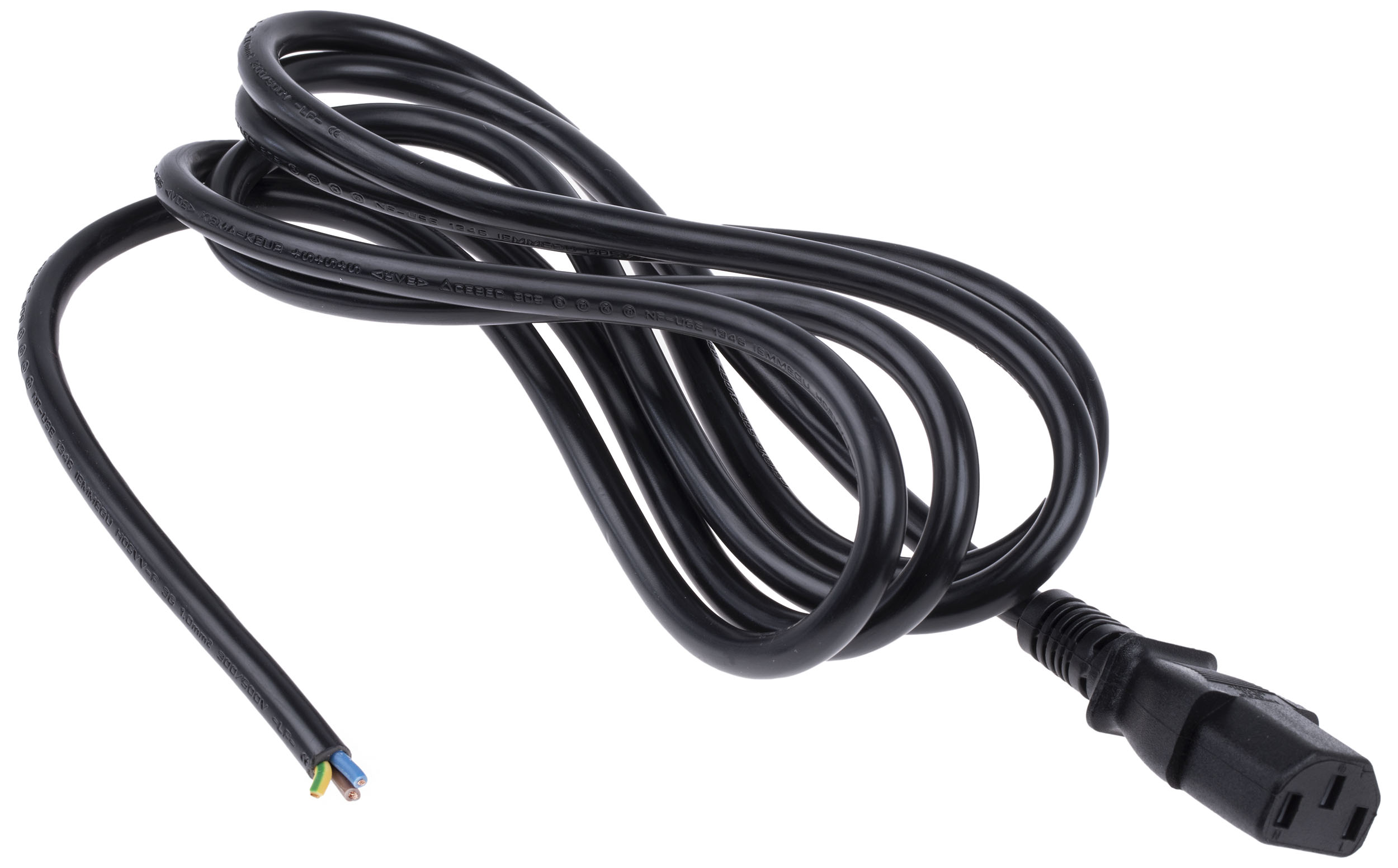 This is 2m power cord C13 to Unterminated (Cable End) 10 A 250 V manufactured by RS Pro. The manufacturer part number is 731-6153. The product has a current rating of 10a. The product complies with all safety standards, such as enec. Moreover, the product has a nominal 250 v voltage rating. The connector 1 has a straight orientation. This connector 1 is a female. The sheath has an adorable black colour. Its accurate length is 2m. The product has 1mm² cross section area. Whereas the outer sheath is manufactured from pvc material. While the Connector 2 is unterminated. Connector 2 is a female connector. Connector 1 is iec c13.
