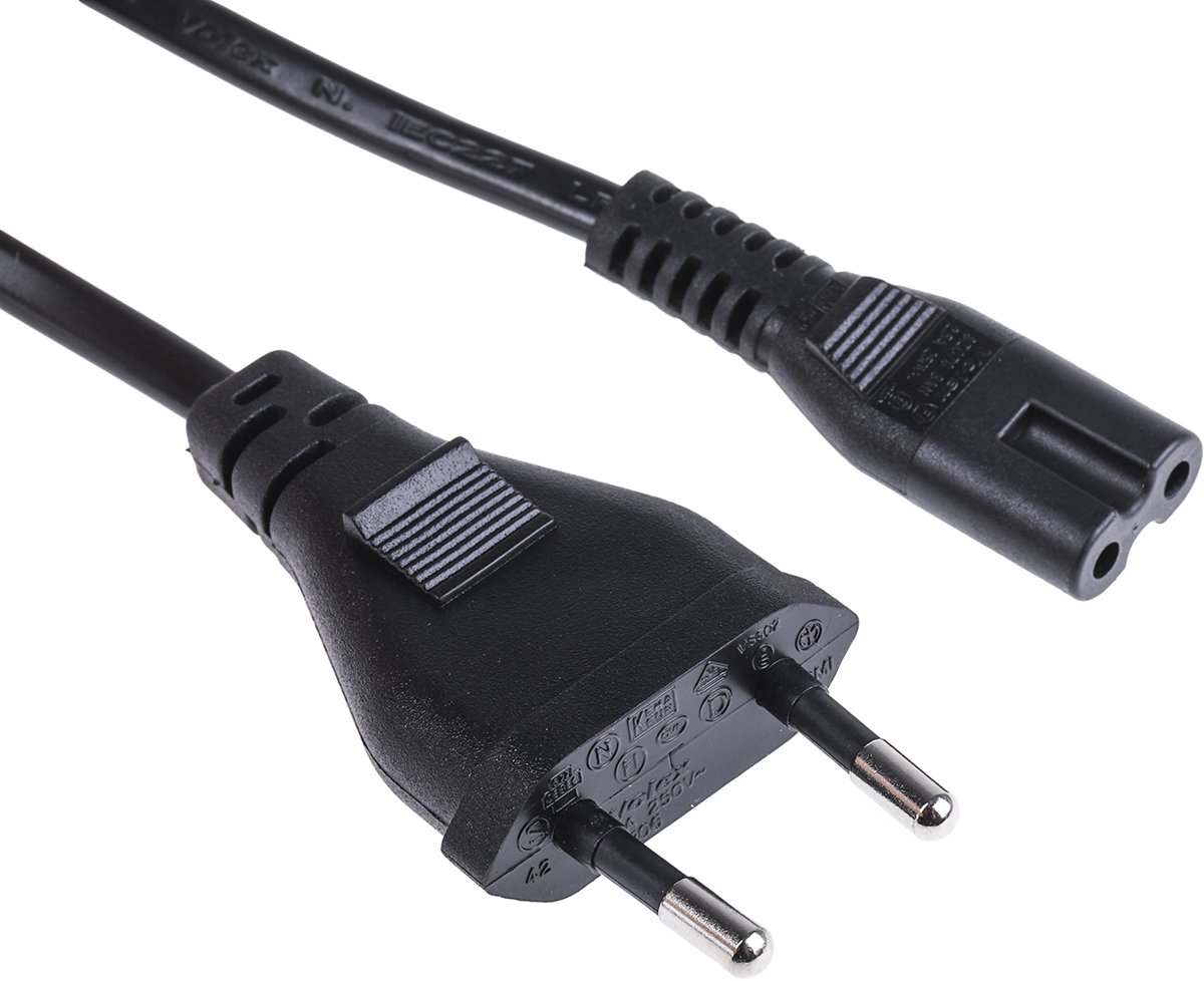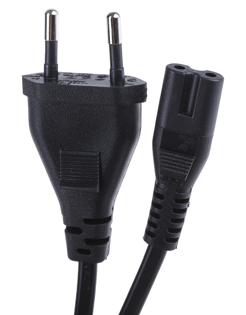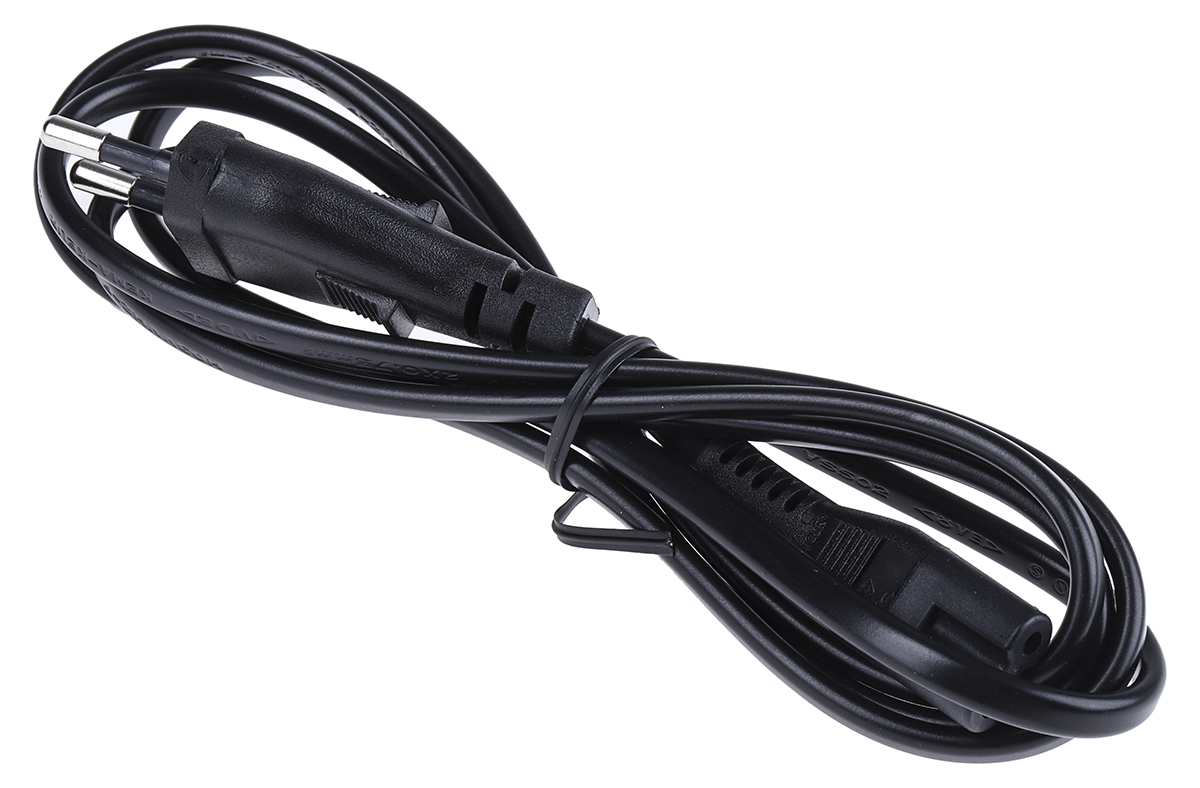 This is 1.5m power cord C7 to Europlug (CEE 7/16) 2.5 A 250 V manufactured by RS Pro. The manufacturer part number is 321-203. The product has a current rating of 2.5 a. The product complies with all safety standards, such as cebec, demko, fimko, imq, kema, lcie, nemko, ove, semko, sev, vde. Moreover, the product has a nominal 250 v voltage rating. This connector 1 is a female. The sheath has an adorable black colour. Its accurate length is 1.5m. Whereas the outer sheath is manufactured from pvc material. While the Connector 2 is type c europlug. Connector 2 is a male connector. Connector 1 is iec c7.