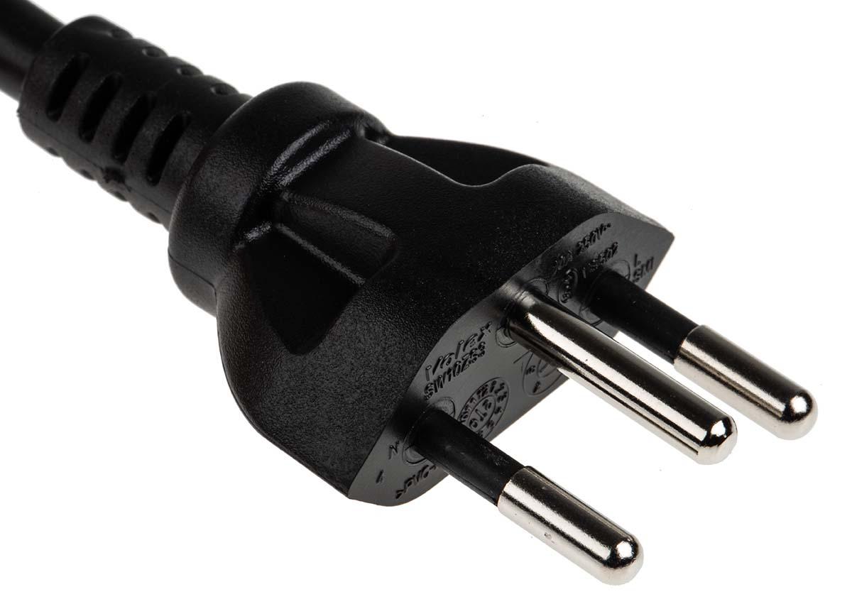 This is 2m power cord C13 to Type N (SEV 1011) 10 A 250 V manufactured by RS Pro. The manufacturer part number is 731-6201. The product has a current rating of 10 a. The product complies with all safety standards, such as saa. Moreover, the product has a nominal 250 v voltage rating. This connector 1 is a female. The sheath has an adorable black colour. Its accurate length is 2m. Whereas the outer sheath is manufactured from pvc material. While the Connector 2 is type j swiss plug. Connector 2 is a male connector. Connector 1 is iec c13.