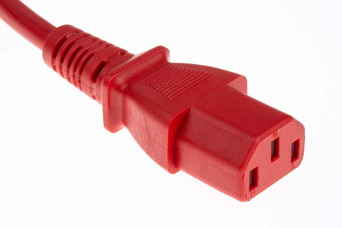 This is 1.5m Power Cable Assembly C13 to C14 (IEC) manufactured by RS Pro. The manufacturer part number is 137-3344. Connector 2 is a male connector. This connector 1 is a female. The sheath has an adorable red colour. Its accurate length is 1.5m. The product has 0.75 mm² cross section area. While the Connector 2 is iec c14. Connector 1 is iec c13.