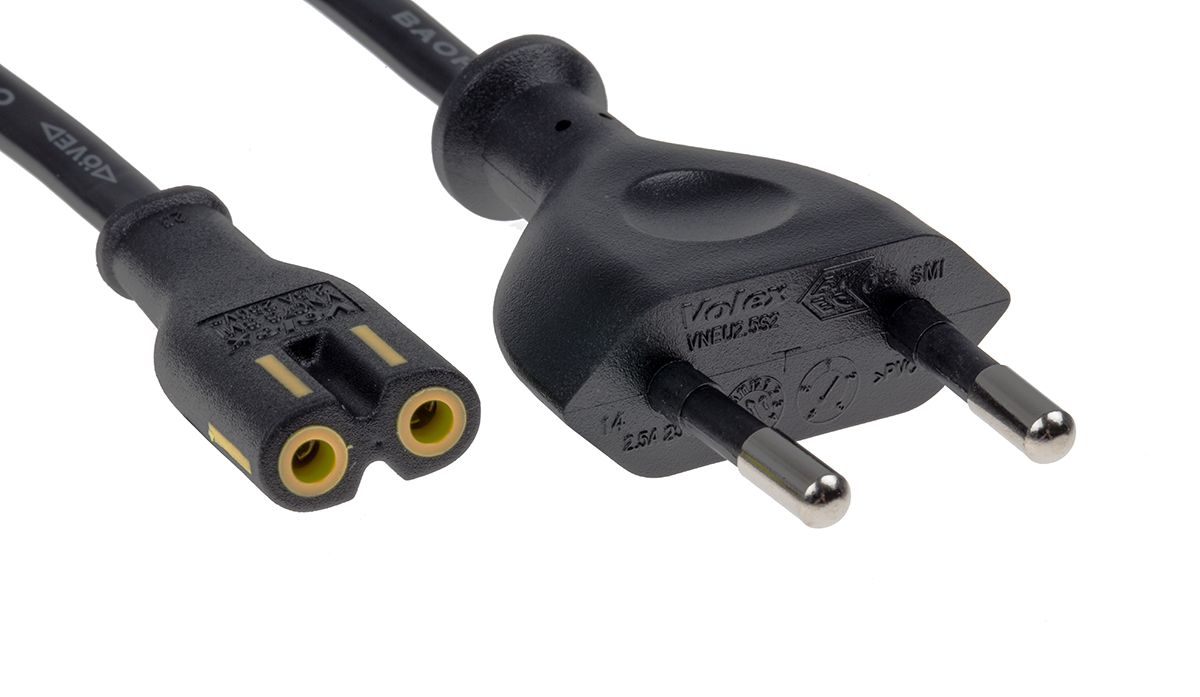 This is 1.8m power cord Self-extinguishing VNEU2.5S2 to VNC7S (VNC7S) 2.5 A 250 V manufactured by RS Pro. The manufacturer part number is 146-9114. The product has a current rating of 2.5 a. The product complies with all safety standards, such as en 50075, en 50525-2-11, en 60320-1, iec 60320-1. Moreover, the product has a nominal 250 v voltage rating. The product has a self-extinguishing fire behaviour. This connector 1 is a female. The sheath has an adorable black colour. Its accurate length is 1.8m. The product has 2 x 0.75 mm² cross section area. Whereas the outer sheath is manufactured from pvc material. While the Connector 2 is type c europlug. Connector 2 is a male connector. Connector 1 is iec c7.