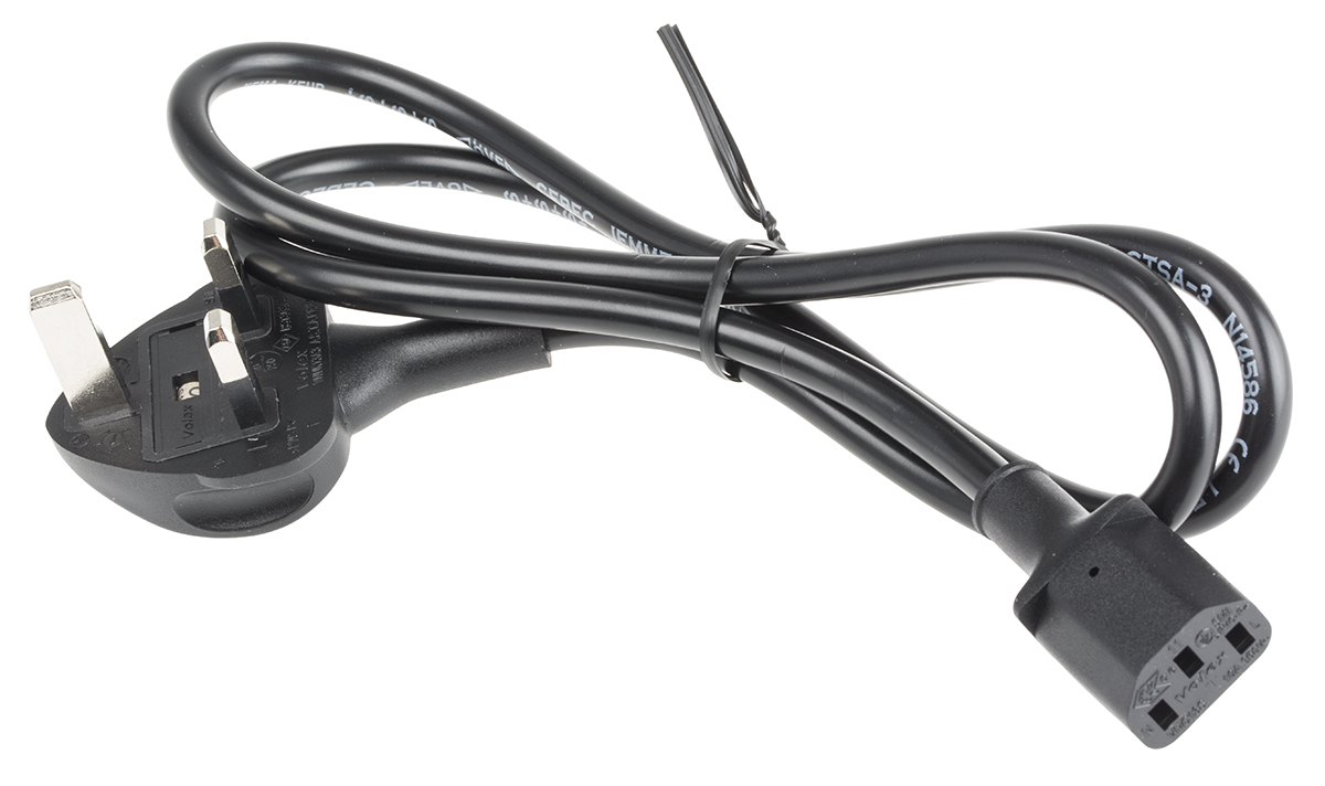 This is 1m power cord Self-extinguishing VNUK13A3 to VNC13S (VNC13S) 10 A 250 V manufactured by RS Pro. The manufacturer part number is 146-9108. The product has a current rating of 10 a. The product complies with all safety standards, such as en 50525-2-11, en 60320-1, iec 60320-1. Moreover, the product has a nominal 250 v voltage rating. The connector 1 has a straight orientation. The product has a self-extinguishing fire behaviour. This connector 1 is a female. The sheath has an adorable black colour. Its accurate length is 1m. The product has 3 x 0.75 mm² cross section area. Whereas the outer sheath is manufactured from pvc material. While the Connector 2 is type g uk plug. Connector 2 is a male connector. Connector 1 is iec c13.
