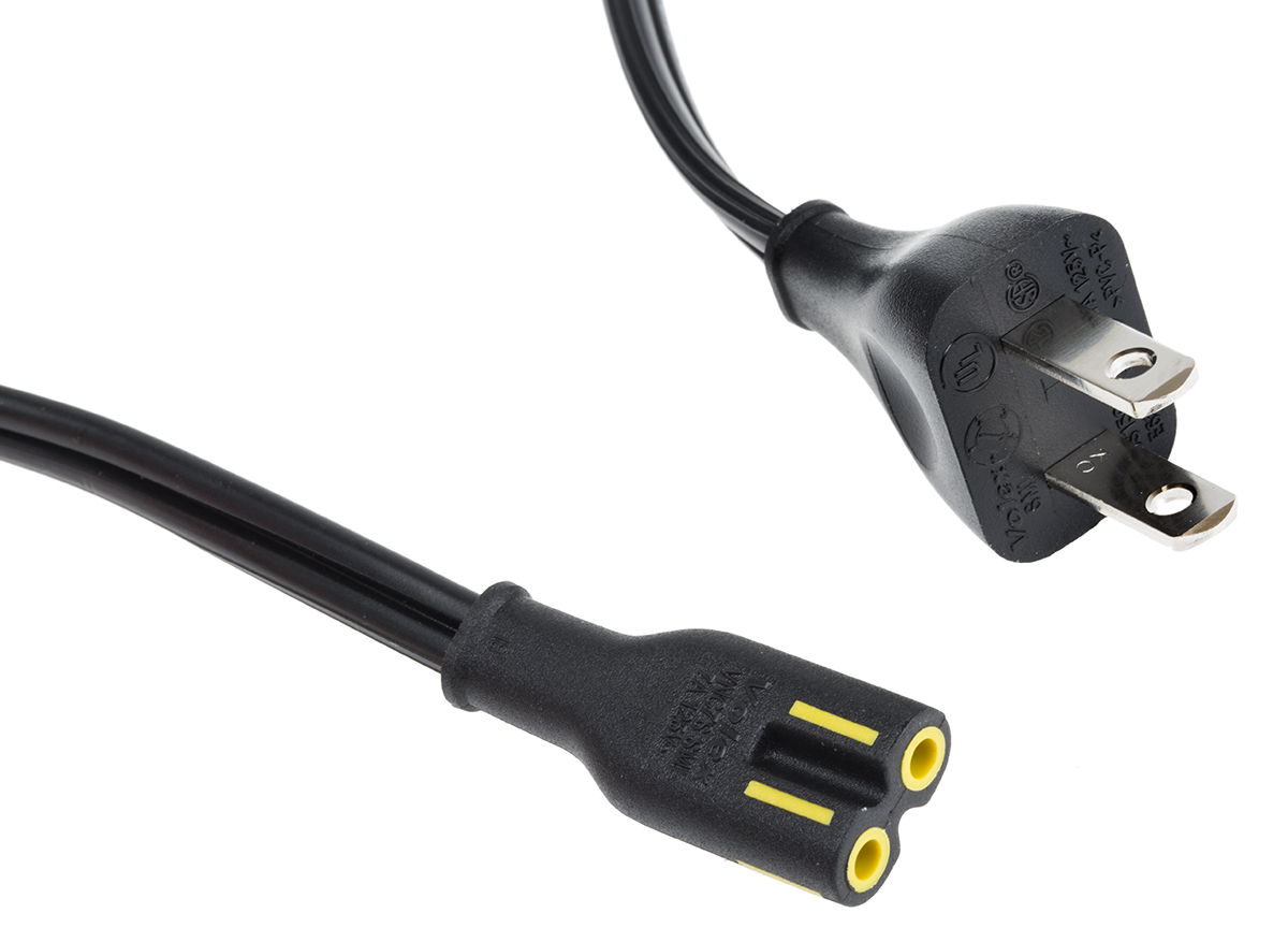 This is 1.8m power cord Self-extinguishing VNUS15S2 to VNC7S (VNC7S) 7 A 300 V ac manufactured by RS Pro. The manufacturer part number is 146-9123. The product has a current rating of 7 a. The product complies with all safety standards, such as csa c22.2 no 21-95, ul 498, ul 62, ul 817. Moreover, the product has a nominal 300 v voltage rating. The product has a self-extinguishing fire behaviour. This connector 1 is a female. The sheath has an adorable black colour. Its accurate length is 1.8m. The product has 2 x 0.824 mm² cross section area. Whereas the outer sheath is manufactured from pvc material. While the Connector 2 is type a us plug. Connector 2 is a male connector. Connector 1 is iec c7.