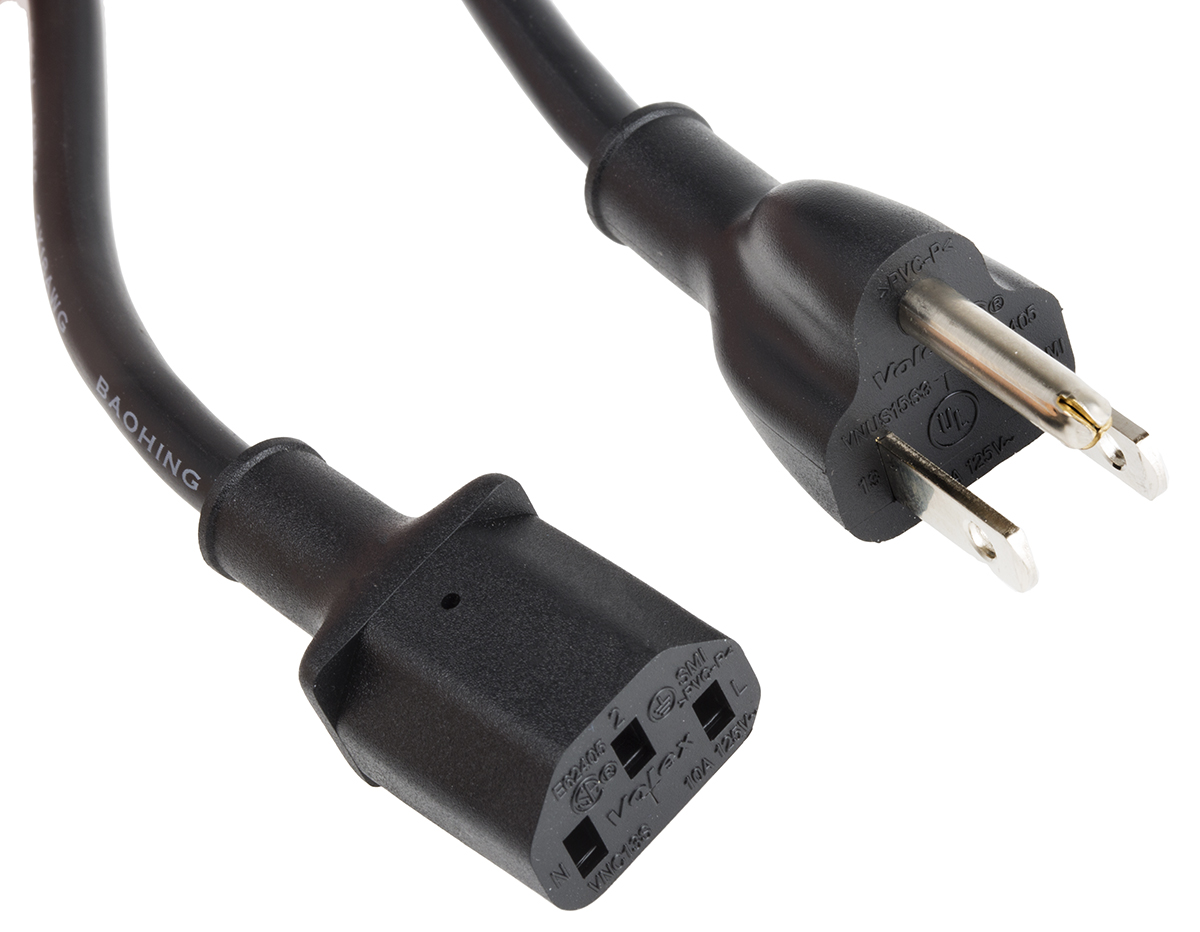 This is 1m Power Cable Self-extinguishing VNUS15S3 to VNC13S (VNC13S) 10 A 300 V ac manufactured by RS Pro. The manufacturer part number is 146-9127. The product has a current rating of 10 a. The product complies with all safety standards, such as csa c22.2 no 21-95, ul 498, ul 62, ul 817. Moreover, the product has a nominal 300 v voltage rating. The product has a self-extinguishing fire behaviour. This connector 1 is a female. The sheath has an adorable black colour. Its accurate length is 1m. The product has 3 x 0.824 mm² cross section area. Whereas the outer sheath is manufactured from pvc material. While the Connector 2 is type b us plug. Connector 2 is a male connector. Connector 1 is iec c13.