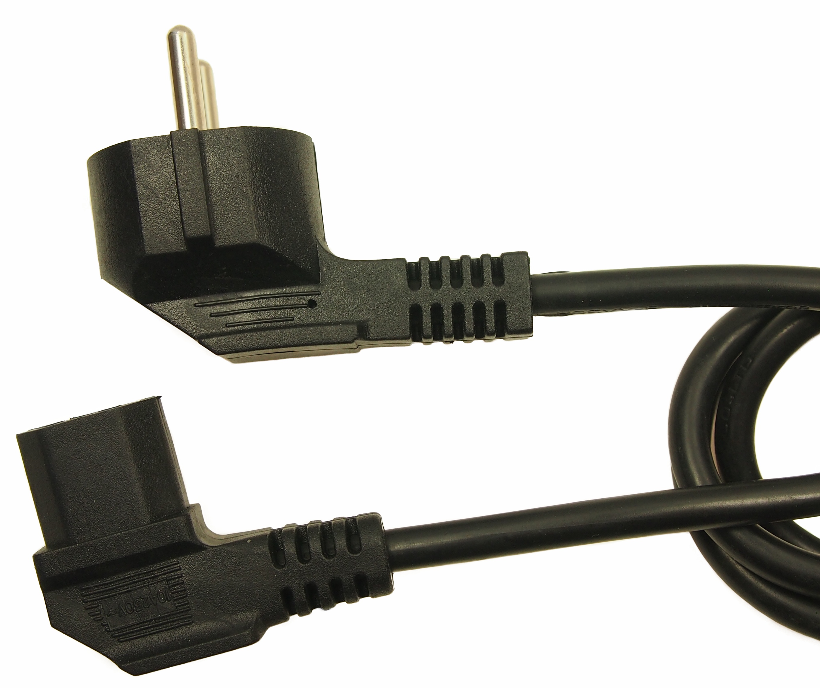 This is Right Angle CEE 7/7 Plug to Right Angle IEC C13 Socket Power Cord 2.5m manufactured by RS PRO. The manufacturer part number is 279-6310. In addition, its connector 2 orientation is right angle . The product has a current rating of 10a. The product complies with all safety standards, such as vde. Moreover, the product has a nominal 250v voltage rating. The connector 1 has a right angle orientation. This connector 1 is a male. The sheath has an adorable black colour. Its accurate length is 2.5m. The product has 1 mm² cross section area. Whereas the outer sheath is manufactured from pvc material. While the Connector 2 is iec c13. Connector 2 is a female connector. Connector 1 is cee 7/7.