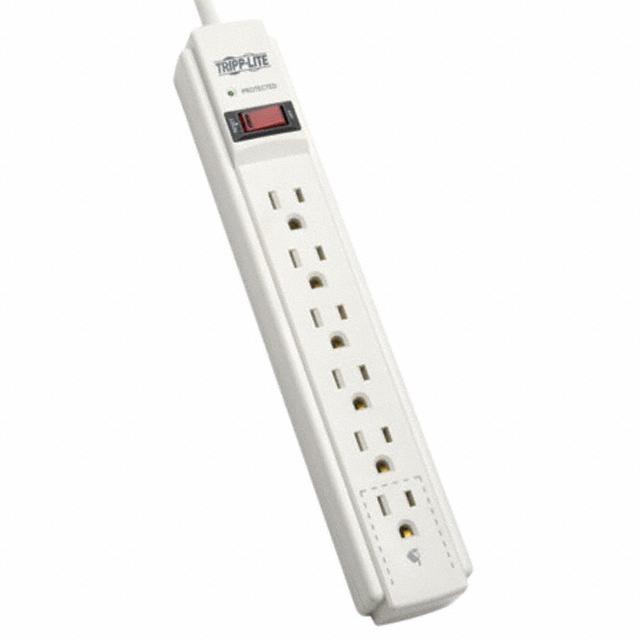 This is manufactured by Tripp Lite. The manufacturer part number is TLP606. It is assigned with possible HTSUS value of 8537.10.9170. The product is rohs3 compliant. The product also features robust plastic housing material. It is approved by csa, cul, ul. The possible product's input voltage is 120v. The product is available in bench, floor, wall configuration. It comes in outlet strip, surge protector configuration. The given maximum current is 15a. AC output connector is nema 5-15r. In addition, it is reach unaffected. The number of AC outlet equals 6 . It is shipped in bulk package . The product is utilised in various regions, including north america. Its typical moisture sensitivity level is not applicable. The cord is 6' (1.83m) long. Overload Protected- circuit breaker(s). It has a long 10 weeks standard lead time. The typical product's weight is 1.1 lbs (499 g). The product protect it!®, is a highly preferred choice for users. It carries an energy of 720j. Connector AC input - nema 5-15p. The product is designated with the ear99 code number.