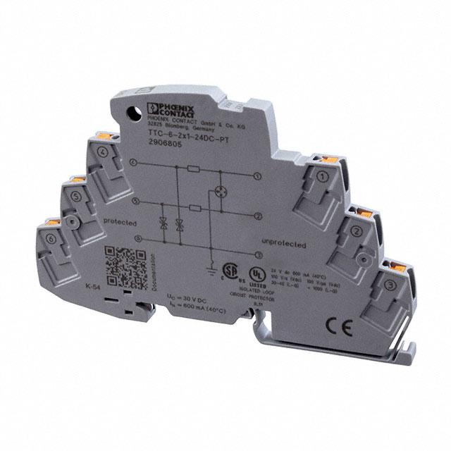 This is 30 V dc 10 (Discharge)kA TTC Surge Protection Device DIN Rail Mounting manufactured by Phoenix Contact. The manufacturer part number is 2906805. The given dimensions of the product include 69.5 x 6.2 x 105.8mm. The product is available in din rail configuration. The product ttc-6-2x1-24dc-pt, is a highly preferred choice for users. Its accurate length is 69.5mm. In addition, the height is 105.8mm. The product comes in 6.2mm depth. Whereas, the minimum operating temperature of the product is -40°c. It has a maximum 30 v dc voltage rating. It can withstand a maximum 10ka surge current . It has a maximum operating temperature of +85°c. Its suppressor is of surge protection device type . It is assigned with possible HTSUS value of 8536.30.8000. The product is rohs3 compliant. The product has a maximum of 21vac, 30vdc continuous operating voltage. The product has -40°c ~ 85°c operating temperature range. It is approved by csa, ul. The product is designed as a nice base + module. A protection level voltage of 130 v. In addition, it is reach affected. The nominal discharge current is 5 ka. The phoenix contact's product offers user-desired applications. Its typical moisture sensitivity level is not applicable. It has a long 7 weeks standard lead time. The product ttc, is a highly preferred choice for users. In addition, bulk is the available packaging type of the product. It carries 10 ka of maximum discharge current. It has equipped with 1 poles. The product is designated with the ear99 code number.