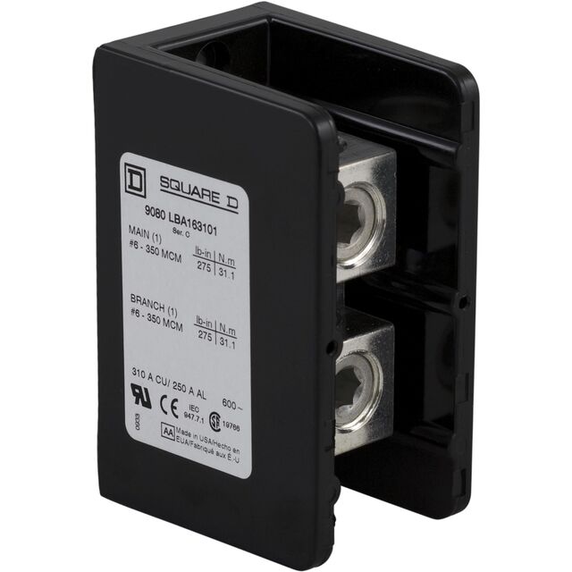 This is manufactured by Schneider Electric. The manufacturer part number is 9080LBC163101. It also exhibits voltage rating of 600 v. It comes in power distribution block configuration. The load side has screw connection. It is assigned with possible HTSUS value of 8536.90.4000. In addition, it is vendor undefined. The line side wires features 250mcm (kcmil) - 6 awg stud size. The schneider electric's product offers user-desired applications. Its typical moisture sensitivity level is not applicable. The product's load side wire/stud size includes 250mcm (kcmil) - 6 awg. While there are total 1 line side connections per pole. Additionally, the product's output is 255 a. While features screw connection at line side. Furthermore, per pole contains 1 load side connections. The product square d, is a highly preferred choice for users. In addition, box is the available packaging type of the product. It has equipped with 1 poles. The product is designated with the ear99 code number.