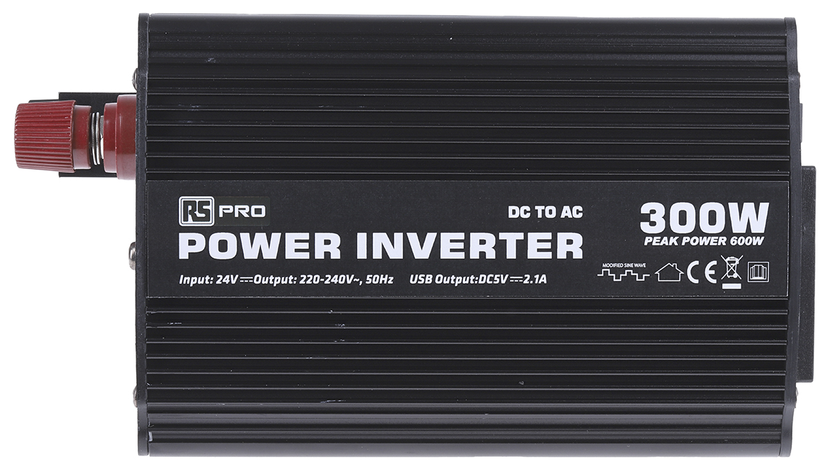 This is 300W Fixed Installation DC-AC Power Inverter 24V dc / 230V ac manufactured by RS Pro. The manufacturer part number is 816-0028. The product has +40°c maximum temperature. The typical product's weight is 630g. It has a standard universal type output connection . It has a standard 50/60hz output frequency range . While its minimum temperature is 0°c. Its accurate length is 195mm. It offers a continuous 300w output power . Furthermore, the product is 102mm wide. The product comes in 55.5mm depth. Its input voltage is 24v dc. It has modified sine wave output power waveform . Features a 230v ac output voltage. It provides robust protection features, such as over temperature protection, over voltage protection, overload protection, reverse polarity protection, short circuit protection. The product also provides special features, such as compact, east to operate, led indicators, lightweight. It has about 600w intermittent output power .