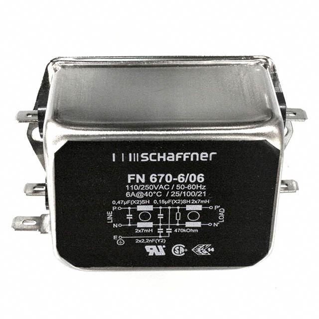 This is manufactured by Schaffner EMC Inc.. The manufacturer part number is FN670-6-06. The product has 250v AC voltage rating. It is assigned with possible HTSUS value of 8536.30.8000. The product is rohs compliant. Moreover, it has quick connect terminal style. Features a 6 a current in A. It is approved by csa, enec, ur. In addition, it is reach unaffected. The product is widely employed in general purpose. The product has a 7mh inductance value. The product is available in two stage configuration. The schaffner emc inc.'s product offers user-desired applications. Its typical moisture sensitivity level is not applicable. The filter is a single phase type with excellent features. The product is available in chassis mount configuration. The product fn 670, is a highly preferred choice for users. In addition, tray is the available packaging type of the product. Features an operating frequency of dc ~ 400hz. The product is designated with the ear99 code number.