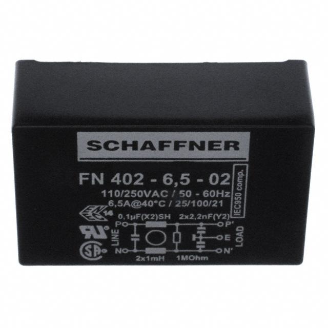 This is manufactured by Schaffner EMC Inc.. The manufacturer part number is FN402-6.5-02. The product has 250v AC voltage rating. It is assigned with possible HTSUS value of 8548.00.0000. The product is rohs3 compliant. Moreover, it has pc pins terminal style. Features a 6.5 a current in A. The product has -25°c ~ 100°c operating temperature range. It is approved by csa, enec, ur. In addition, it is reach unaffected. The product is widely employed in general purpose. The product has a 1mh inductance value. The product is available in single stage configuration. The schaffner emc inc.'s product offers user-desired applications. Its typical moisture sensitivity level is not applicable. The filter is a single phase type with excellent features. It has a long 12 weeks standard lead time. The product is available in through hole configuration. The product fn 402, is a highly preferred choice for users. In addition, tray is the available packaging type of the product. Features an operating frequency of dc ~ 400hz. Moreover, it corresponds to fn402, a base product number of the product. The product is designated with the ear99 code number.