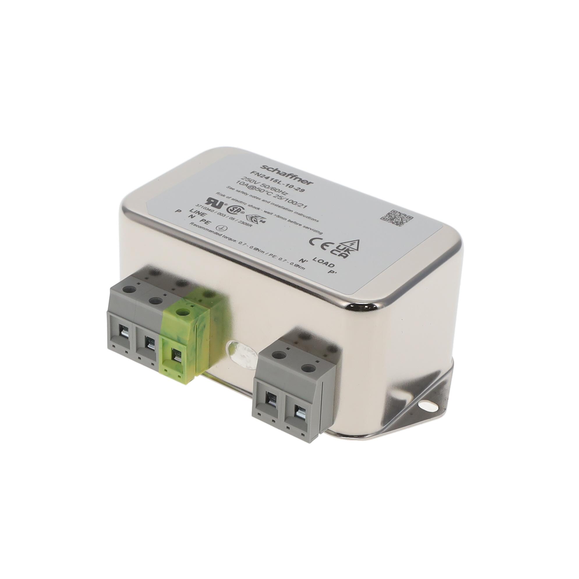 This is manufactured by Schaffner EMC Inc.. The manufacturer part number is FN2415L-10-29. The product has 250v AC voltage rating. It is assigned with possible HTSUS value of 8548.00.0000. The product is rohs3 compliant. Moreover, it has terminal block terminal style. Features a 10 a current in A. The product has -25°c ~ 100°c operating temperature range. It is approved by ce, csa, enec, ukca, ur. In addition, it is reach unaffected. The product is widely employed in general purpose. The product is available in two stage configuration. It is shipped in bulk package . Its typical moisture sensitivity level is not applicable. The filter is a single phase type with excellent features. It has a long 2 weeks standard lead time. The product is available in chassis mount configuration. The product fn 2415, is a highly preferred choice for users. Features an operating frequency of dc ~ 400hz. The product is designated with the ear99 code number.