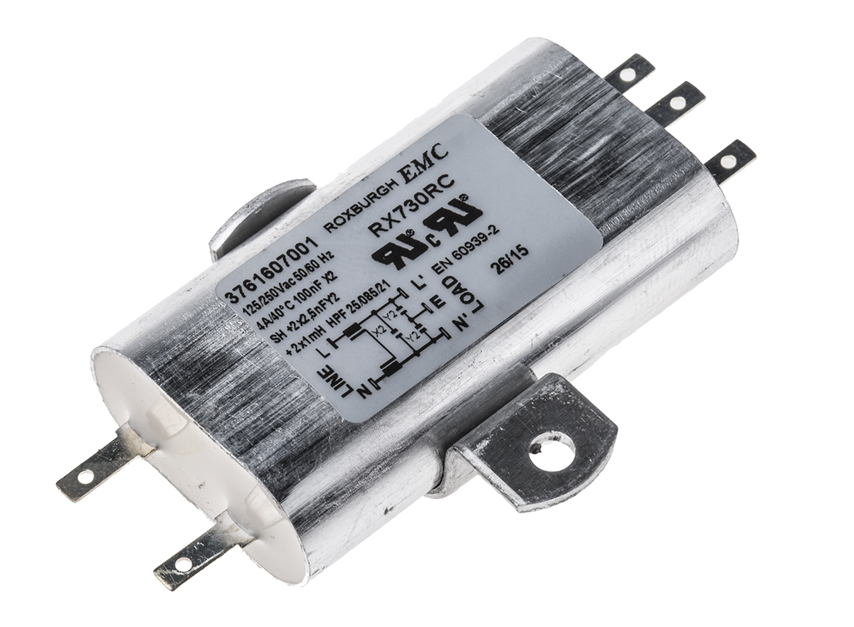 This is RX730 Series 4A 250 V ac 60Hz Chassis Mount RFI Filter with Tab Terminals Single Phase manufactured by Roxburgh EMC. The manufacturer part number is RX730RC. The given dimensions of the product include 68 x 29.5 x 16mm. The product is available in chassis mount configuration. The product rx730, is a highly preferred choice for users. Moreover, it has tab terminal style. Whereas, the minimum operating temperature of the product is -25°c. It harbors 0.24 ma of leakage current. Its accurate length is 68mm. In addition, the height is 16mm. The product comes in 29.5mm depth. The product has a 1 x 2 mh inductance value. It has a maximum 250 v ac voltage rating. Furthermore, the product has 60hz operating frequency range. Whereas it is comprised of 1 phases. It has a maximum operating temperature of +85°c. Additionally, the product has a maximum 4a current rating .