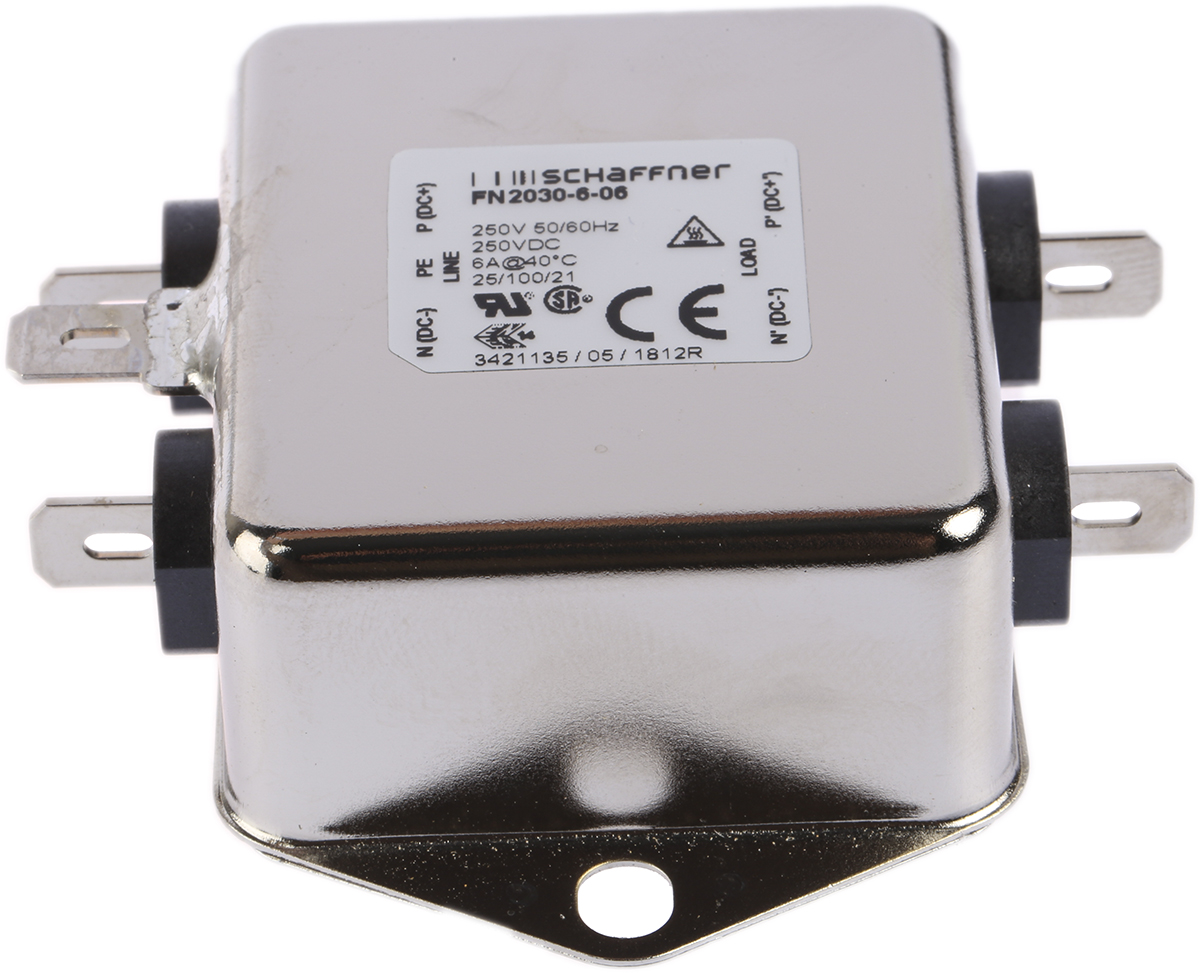 This is FN2030 Series 6A 250 V ac 400Hz Chassis Mount RFI Filter with Tab Terminals manufactured by Schaffner. The manufacturer part number is FN2030-6-06. It carries 680kω resistance. It harbors 0.73ma of leakage current. It also carries 6a maximum current. It has a maximum 250v ac voltage . The product fn2030, is a highly preferred choice for users. Moreover, it has fast-on terminal style. Its accurate length is 71mm. In addition, the height is 22.3mm. It provides a 470nf of capacitance value. The product comes in 46.6mm depth. It includes 1 stages. It has a typical 3.2w power loss ratio . The product has a 8 mh inductance value. Furthermore, the product has 400 hz operating frequency range. Whereas it is comprised of 1 phases. emi filter is a versatile product designed to provide user-defined applications. It has a maximum operating temperature of 100°c. Whereas, the minimum operating temperature of the product is -25°c. It has a chassis type mount .