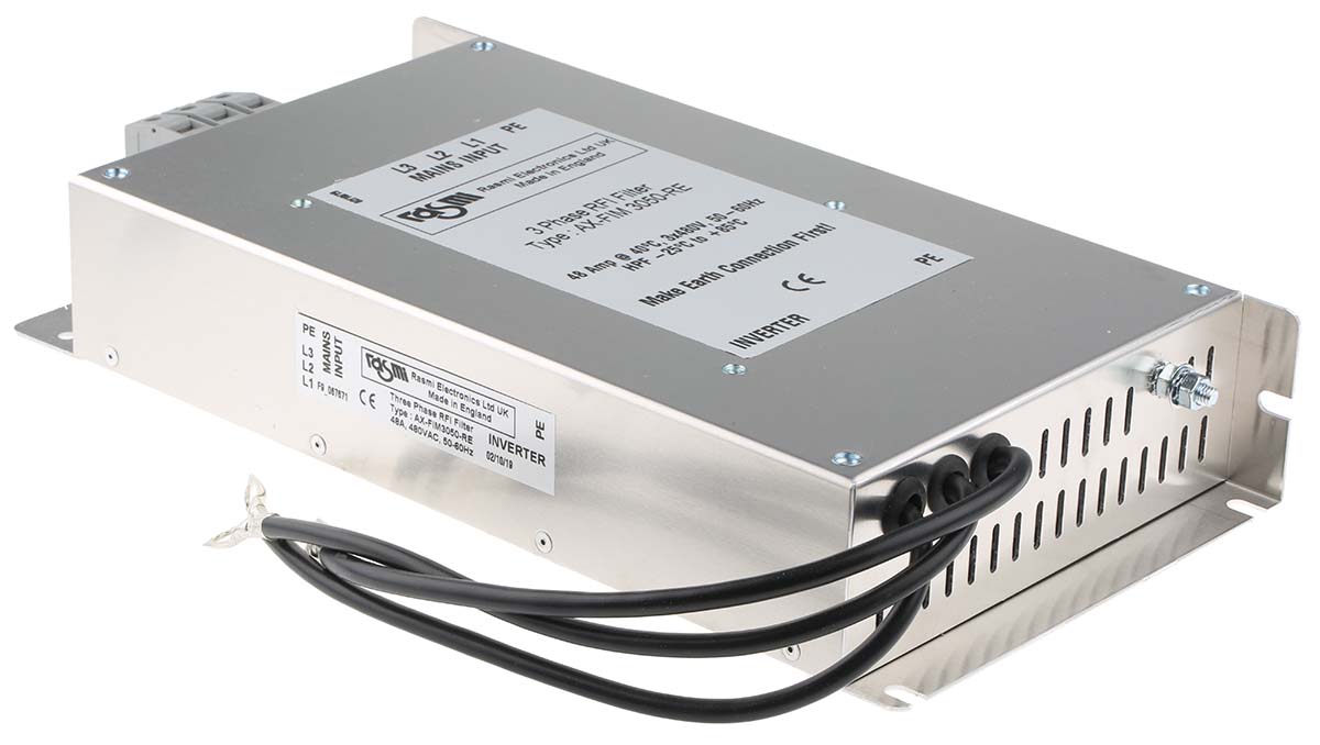 This is EMI Filter 50 A 400 V ac 15 kW for use with MX2 Series manufactured by Omron. The manufacturer part number is AX-FIM3050-RE. Whereas it is comprised of 3 phases. The product comes in 62mm depth. Its accurate length is 357mm. It has a maximum 400 v ac voltage rating. The given dimensions of the product include 357 x 182 x 62mm.