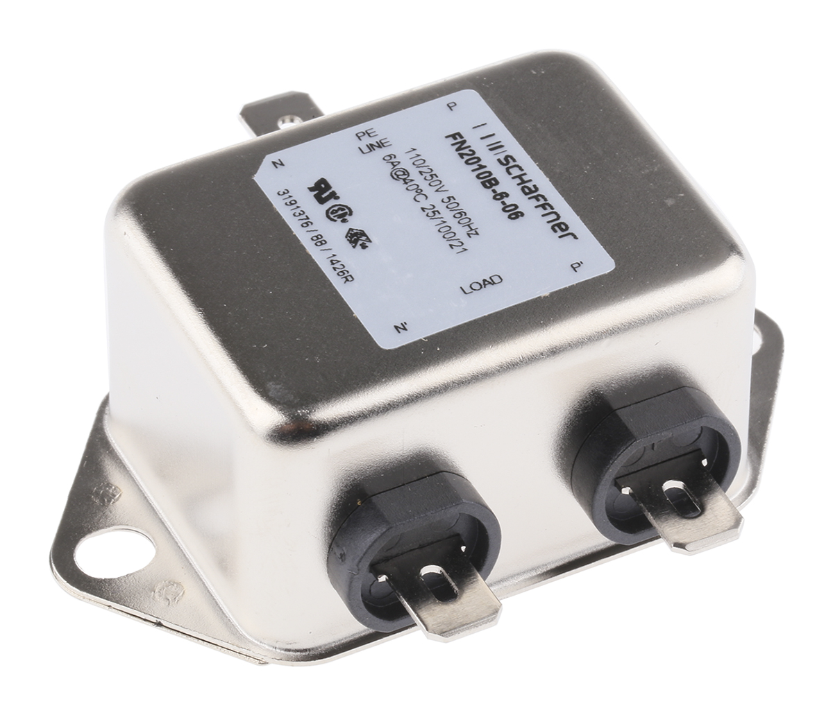 This is FN2010B Series 6A 250 V ac 400Hz Chassis Mount RFI Filter with Tab Terminals manufactured by Schaffner. The manufacturer part number is FN2010B-6-06. The given dimensions of the product include 64 x 35 x 24.3mm. The product is available in chassis mount configuration. The product fn2010b, is a highly preferred choice for users. Moreover, it has fast-on terminal style. Whereas, the minimum operating temperature of the product is -25°c. It harbors 0.002 ma of leakage current. Its accurate length is 64mm. In addition, the height is 24.3mm. It provides a 4.7 nf, 100nf of capacitance value. The product comes in 35mm depth. It has a typical 1.7w power loss ratio . The product has a 1 mh inductance value. It has a maximum 250 v ac/dc voltage rating. Furthermore, the product has 400hz operating frequency range. Whereas it is comprised of 1 phases. It includes single stage stages. It has a maximum operating temperature of +100°c. Additionally, the product has a maximum 6a current rating . It carries 1mω resistance.