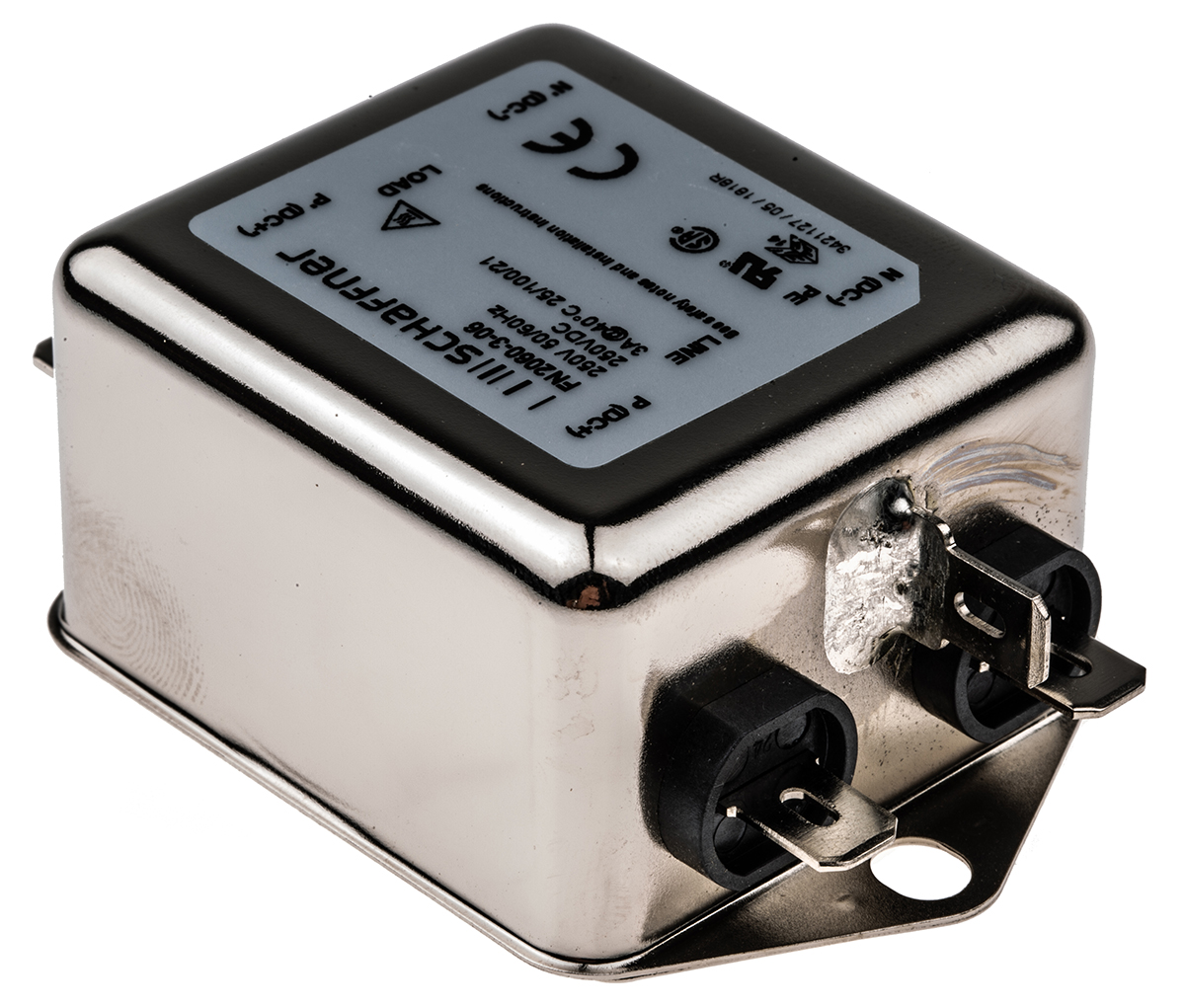 This is FN2060 Series 3A 250 V ac 400Hz Chassis Mount RFI Filter with Tab Terminals Single Phase manufactured by Schaffner. The manufacturer part number is FN2060-3-06. The given dimensions of the product include 46.6 x 71 x 29.3mm. The product is available in chassis mount configuration. The product fn2060, is a highly preferred choice for users. Moreover, it has fast-on terminal style. Whereas, the minimum operating temperature of the product is -25°c. It harbors 0.734 ma of leakage current. Its accurate length is 46.6mm. In addition, the height is 29.3mm. It provides a 4.7 nf, 220nf of capacitance value. The product comes in 71mm depth. The product has a 2.5 mh inductance value. It has a maximum 250 v ac/dc voltage rating. Furthermore, the product has 400hz operating frequency range. Whereas it is comprised of 1 phases. It includes two stage stages. It has a maximum operating temperature of +100°c. Additionally, the product has a maximum 3a current rating . It carries 1mω resistance.