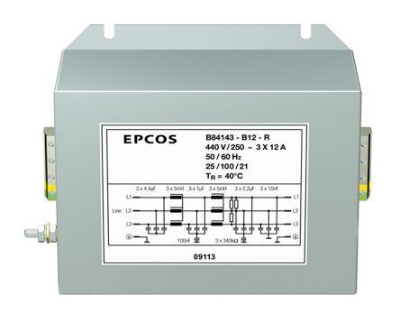 This is B84143B Series 25A 440 V ac 60Hz RFI Filter 3 Phase manufactured by EPCOS. The manufacturer part number is B84143B25R. The product complies with all safety standards, such as ul 1283. The given dimensions of the product include 91 x 216 x 156. The product is available in screw mount configuration. The product b84143b*r000, is a highly preferred choice for users. Additionally, the product has a maximum 25a current rating . Moreover, it has terminal block terminal style. Its accurate length is 91mm. In addition, the height is 156mm. The product comes in 216mm depth. It harbors 0.862 ma of leakage current. It has a maximum 440 v ac voltage rating. Furthermore, the product has 50 → 60hz operating frequency range. Whereas it is comprised of 3 phases. It has a maximum operating temperature of +100°c. Whereas, the minimum operating temperature of the product is -25°c. It carries 10mω resistance.