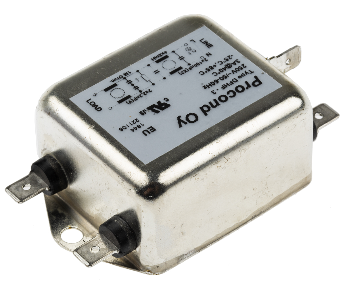 This is DFHF Series 3A 250 V ac 400Hz Chassis Mount RFI Filter with Tab Terminals manufactured by RS Pro. The manufacturer part number is 239-848. The given dimensions of the product include 46 x 76 x 28mm. The product is available in chassis mount configuration. The product dfhf, is a highly preferred choice for users. Moreover, it has tab terminal style. Whereas, the minimum operating temperature of the product is -25°c. It harbors 0.2 ma of leakage current. Its accurate length is 46mm. In addition, the height is 28mm. It provides a 0.1 x 2 μf, 2200 x 2pf of capacitance value. The product comes in 76mm depth. The product has a 2 x 2 mh inductance value. It has a maximum 250 v ac voltage rating. Furthermore, the product has 400hz operating frequency range. It includes two stage stages. It has a maximum operating temperature of +85°c. Additionally, the product has a maximum 3a current rating . It carries 1mω resistance.