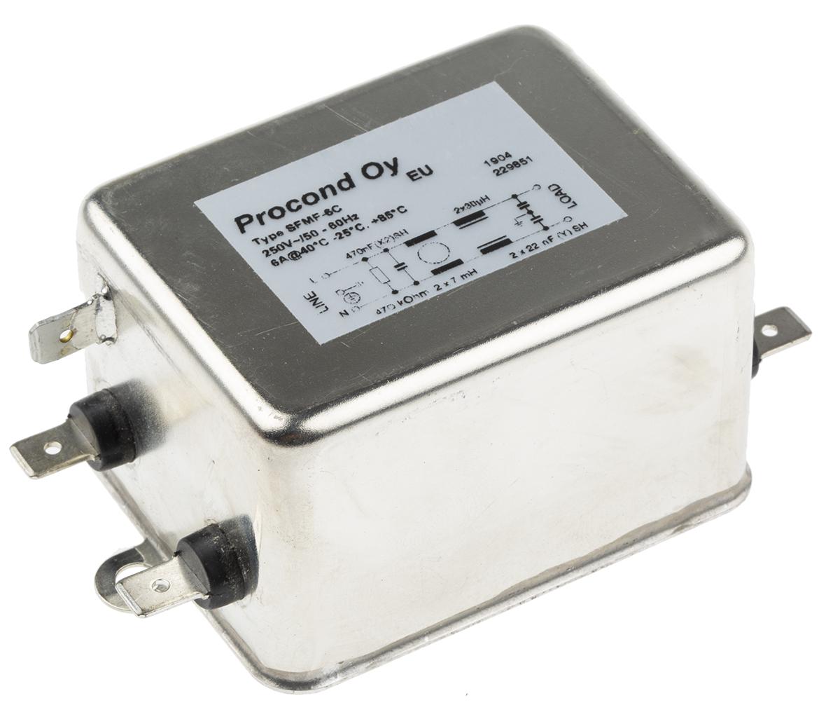 This is SFMF Series 6A 250 V ac 400Hz Chassis Mount RFI Filter with Tab Terminals manufactured by RS Pro. The manufacturer part number is 240-719. The given dimensions of the product include 90 x 52 x 40mm. The product is available in chassis mount configuration. The product sfmf, is a highly preferred choice for users. Moreover, it has tab terminal style. Whereas, the minimum operating temperature of the product is -25°c. It harbors 2.1 ma of leakage current. Its accurate length is 90mm. In addition, the height is 40mm. It provides a 470 nf, 22000 x 2pf of capacitance value. The product comes in 52mm depth. The product has a 0.03 x 2 mh, 7 x 2 mh inductance value. It has a maximum 250 v ac voltage rating. Furthermore, the product has 400hz operating frequency range. It includes two stage stages. It has a maximum operating temperature of +85°c. Additionally, the product has a maximum 6a current rating . It carries 470kω resistance.