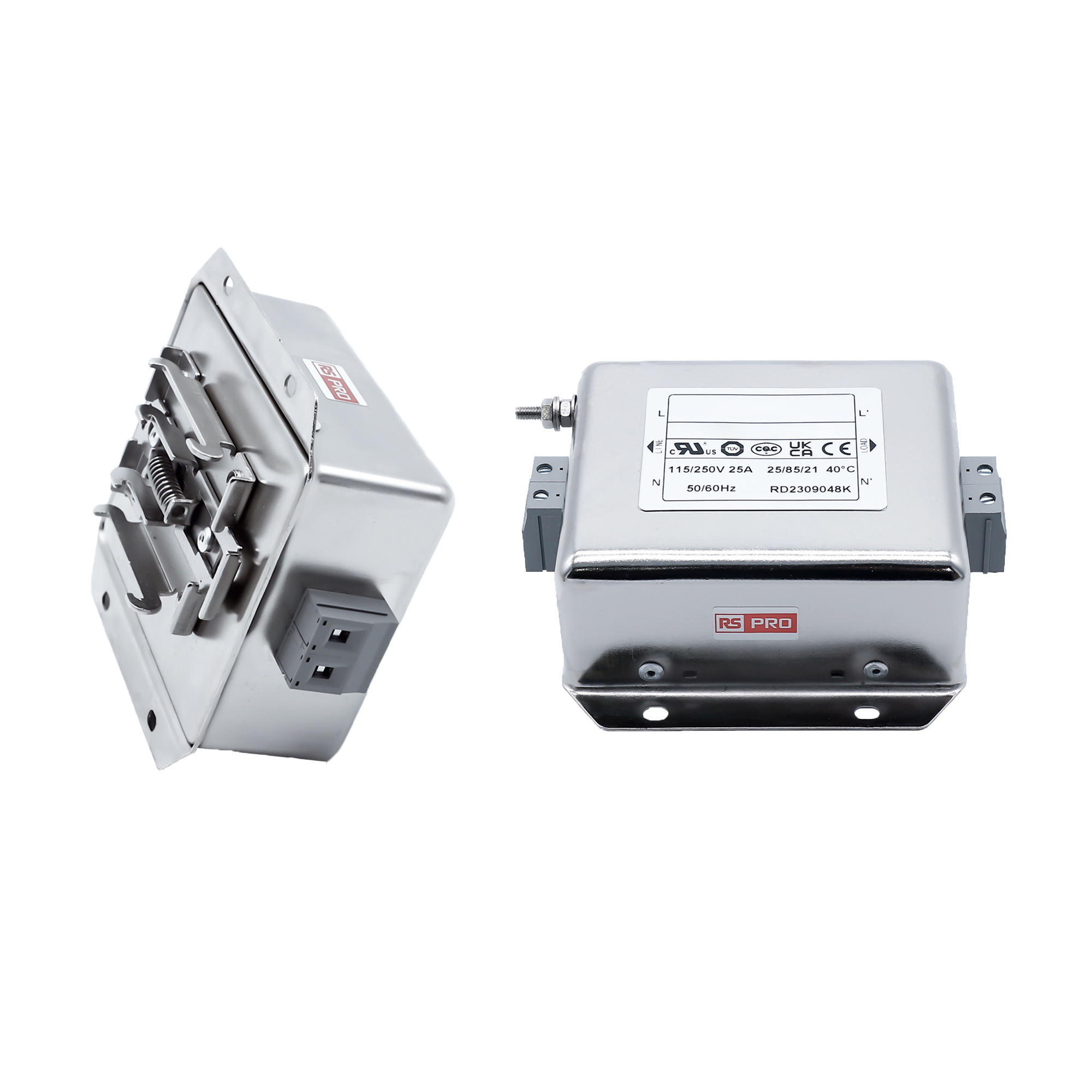 This is 25A 250 V ac 50/60Hz Chassis Mount Power Line Filter Terminal Block Single Phase manufactured by RS PRO. The manufacturer part number is 278-5149. The given dimensions of the product include 105 x 96 x 41mm. The product is available in chassis mount configuration. Moreover, it has terminal block terminal style. Additionally, the product has a maximum 25a current rating . It harbors 1.0/1.9ma of leakage current. It carries 470kω resistance. In addition, the height is 41mm. It provides a 1.0uf, 10000pf of capacitance value. The product comes in 96mm depth. Its accurate length is 105mm. The product has a 2 x 2.5mh inductance value. It has a maximum 250 v ac voltage rating. Furthermore, the product has 50/60hz operating frequency range. Whereas it is comprised of single phases. It includes single stage stages. It has a maximum operating temperature of +85°c. Whereas, the minimum operating temperature of the product is -25°c.