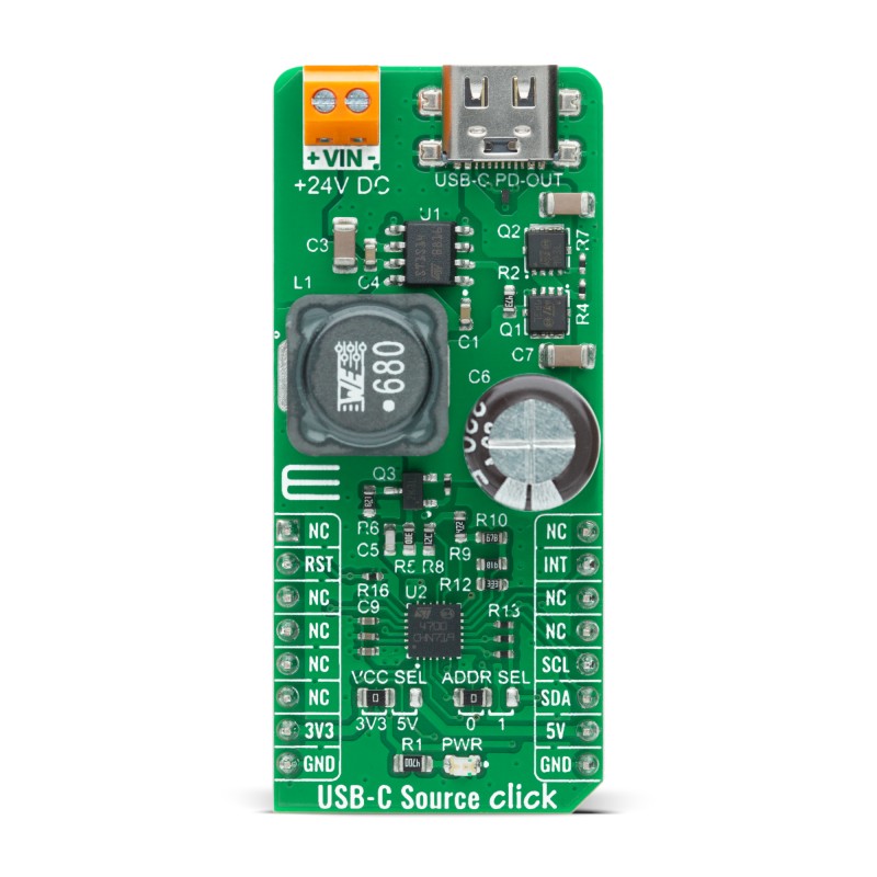 This is USB-C Source Click for STUSB4700 manufactured by Brand-Rex. The manufacturer part number is MIKROE-4329. Featured Device stusb4700. The kit is classified as development board. This kit is known as usb-c source click, consists of highly versatile and user-desired tools.