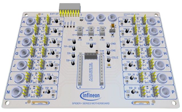 This is SPIDERPLUSMB_EVAL Mother Board Evaluation Board for SPIDERPLUSMB_EVAL Mother Board for Driving Relays LEDs manufactured by Infineon. The manufacturer part number is SPIDERPLUSMBEVALTOBO1. It has a/an evaluation board power management function . This kit is known as spiderplusmb_eval mother board, consists of highly versatile and user-desired tools. Featured Device spiderplusmb_eval mother board. The kit is classified as evaluation board. The product is highly suitable for driving relays, leds, small motors.